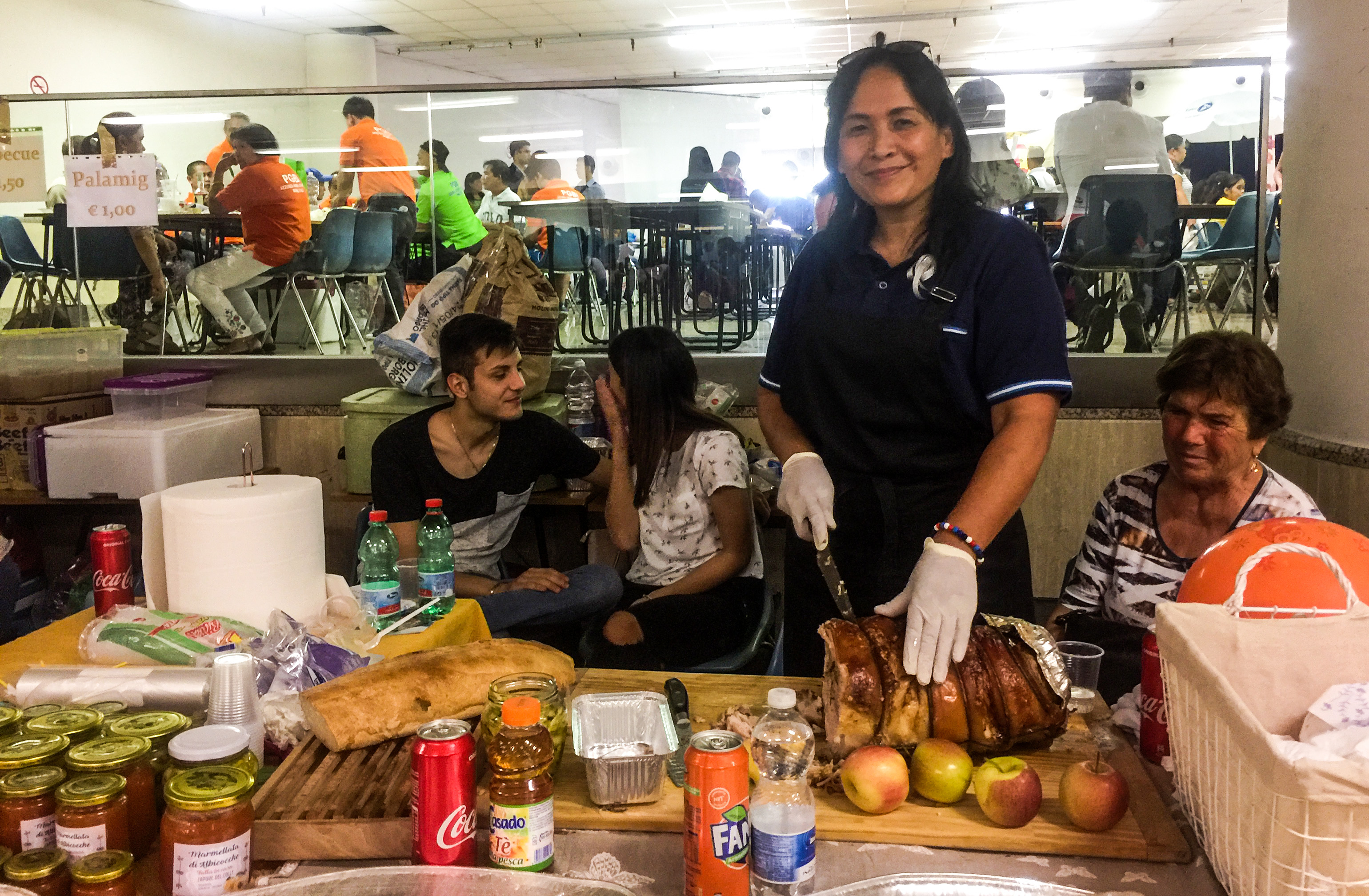 La mattina trascorre e nel pomeriggio la comunità filippina si raduna in gruppetti, distribuiti intorno ai diversi tavoli pronti ad assaggiare i sapori della gastronomia tipica del loro paese, ma quest’anno c’è una novità: la porchetta di Ariccia appena cucinata nello stand di Veronica, giovane casalinga proveniente da Manila che si è trasferita 28 anni fa a Roma per amore e attualmente mamma di due figli italo-filippini.