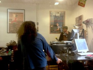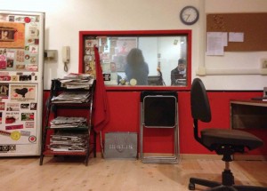 La sala di Radio Onda Rossa, oltre il vetro Linda ed Egay