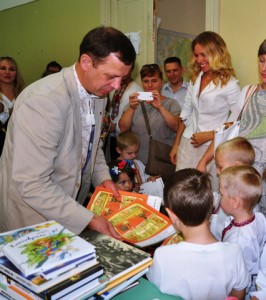 Il deputato Mykhalo Khimil consegna i libri ai bambini – Foto di Roksolana Iakhvak-Jankovic