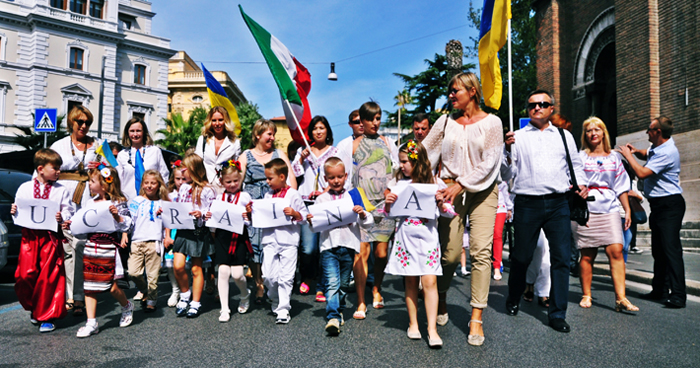 Sabato 28 settembre. Si festeggia il primo campanello alla scuola ucraina di sabato “Prestigio”, in via Puglie 31, a Roma. Il lungo corridoio è gremito di bambini, ragazzi e genitori, vestiti con abiti tradizionali: camicie bianche dagli elaborati ricami e per le donne corone di fiori e nastri colorati. Una bimbetta di circa 2 anni fa svolazzare allegramente la sua corona mentre sgambetta avanti e indietro tra capannelli di mamme sorridenti, bimbi dalle facce vispe e adolescenti immersi in chiacchiere e scherzi. Il tutto, rigorosamente, in lingua ucraina.