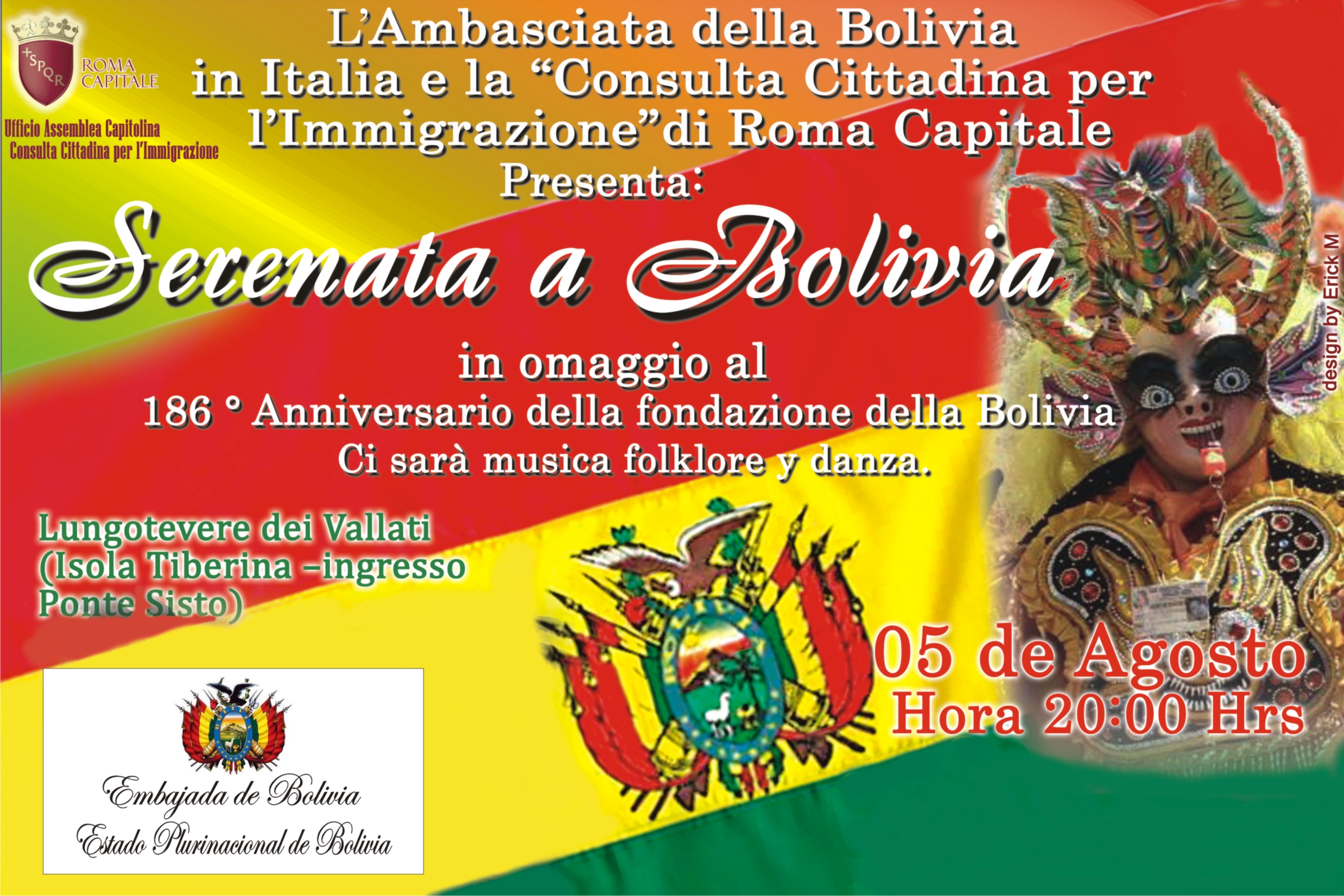 Il 6 agosto ricorre il 186° anniversario dell’indipendenza Boliviana. Venerdi 5 si festeggerà all’isola Tiberina dalle 20.00 in poi con spettacoli di musica e danza folcloristica promossi dall’Ambasciata Boliviana di Roma. Era il 6 agosto 1825 quando si concluse la guerra iniziata dai Tarijchegnosa a Tablada de la Tolomosa, vicino Tarija. La città, dalla sua università “San Francisco Javier”, proclamò per prima l’indipendenza dalla Spagna e diede il nome al nuovo Stato in onore a Simón Bolívar, uno dei patrioti a capo dell’esercito.