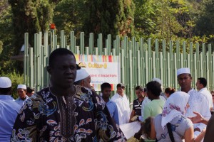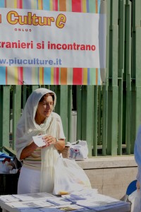 Approfittando del clima di festa i volontari di Piuculture distribuiscono volantini in italiano e in arabo ai fedeli che escono a gruppi dalla moschea e si accalcano tra le bancarelle di dolci e prodotti tipici. L’associazione Italia-Bangladesh presente con volontari in angla e italiano, informa su corsi che stanno partendo a piazza Vittorio e in altre zone dense di stranieri. Ci si muove a fatica nel piccolo suq sotto tendoni che mal riparano dal caldo della giornata. “Davvero non si paga?”. Rassicurati su questo punto, molti – soprattutto giovani e donne – si fermano a chiedere gli orari e le sedi. Per chi pratica internet la risposta è sul volantino, gli altri vengono inviati allo stand dove otterranno maggiori ragguagli.