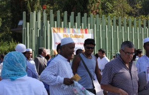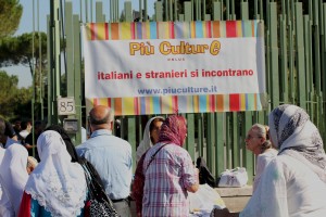 All’ingresso della moschea fin dalla prima mattina del 30 agosto è attivo lo stand di Piuculture. Sotto lo striscione appeso ai cancelli, migliaia di fedeli che affluiscono per la grande preghiera trovano informazioni sui corsi di italiano per stranieri che partono a settembre, in tante zone della città.