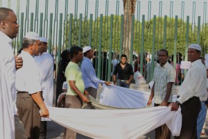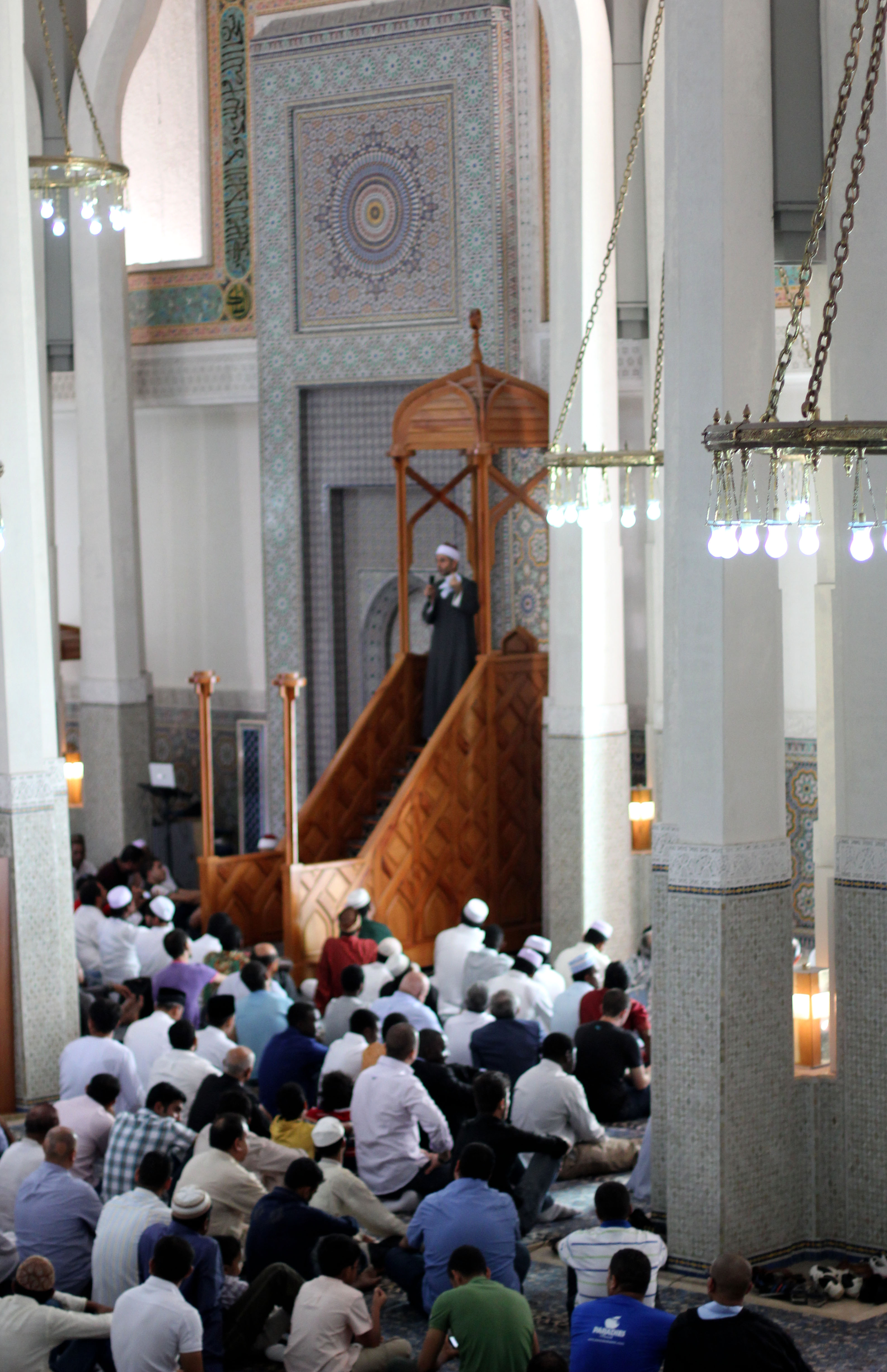 La preghiera scandisce la mattinata, tre momenti che si alternano con gli incontri nel cortile e nel mercato antistante l’entrata principale. Le offerte per la Moschea vengono raccolte fuori dal cancello, dove coppie di uomini tendono dei lenzuoli nei quali la gente passando può lasciare un libero contributo. Per l’occasione, come ogni anno, sono presenti due Imam ‘in trasferta’ dall’Egitto che intervengono nel sermone di chiusura delle preghiere. In queste non ci sono strumenti musicali ad accompagnare le parole dei fedeli bensì il delicato tonfo corale di centinaia di uomini e donne che si inginocchiano.