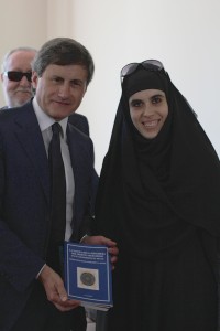 La visita del sindaco. Verso le undici una calca di fotografi e curiosi segnala che ai piedi della fontana sta accadendo qualcosa. Il Sindaco di Roma Gianni Alemanno incontra i fedeli, il presidente del Centro Culturale Islamico della Grande Moschea e i delegati dei vari paesi arabi. Sabrina Lei, trentenne romana, aspetta di consegnargli dei libri della sua neonata Jay Editore. “Traduciamo in italiano i testi dei grandi autori musulmani. Vorremmo diffondere una corretta conoscenza della cultura islamica. Oggi ne stiamo dando in omaggio alcune copie”. “Crediamo che una cultura islamica europea sia possibile. Quando vado in giro con Sabrina non credono che sia italiana, questo perché porta il velo. Come fossero due cose inconciliabili” interviene Abdel Latif Chalikandi, il marito di Sabrina. E’ indiano e ha conosciuto sua moglie all’università Gregoriana. “Io studiavo filosofia antica e Abdel, che viveva a Londra, è venuto per un seminario sull’islam” racconta Sabrina. Sposati da cinque anni uniscono la passione per la filosofia con il credo religioso.