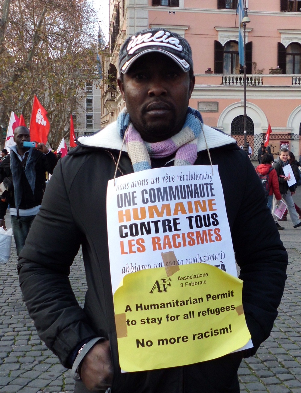 organizzazioni presenti in tutta Italia.“Il vero successo è essere riusciti a portare in piazza per la prima volta profughi e rifugiati con una mobilitazione che è interamente autorganizzata e autofinanziata” dichiara Gianluca Petruzzo, responsabile dell’Associazione 3 Febbraio. “Chiediamo che sia garantito il permesso di soggiorno umanitario attualmente negato a chi fugge da paesi in guerra, come la Libia, ma proviene da stati ritenuti non in conflitto”. I primi risultati non tardano ad arrivare: “Martedì 24 gennaio incontreremo il Ministro per la Cooperazione internazionale e l’Integrazione, Andrea Riccardi, per discutere della questione. Anche in quell’occasione intendiamo organizzare iniziative nei Centri di tutta Italia”.“Il ricatto della clandestinità deve cessare” afferma Antonio Bicchielli del Comitato Stop Razzismo di Prato. “Vogliamo una nuova sanatoria e il recupero delle pratiche dei tanti fratelli truffati nel 2009 da agenzie che non hanno depositato i documenti nelle Prefetture, impedendo a chi aveva pagato di essere regolarizzato”.Le divisioni vanno abbattute con la vicinanza e la solidarietà, spiega Giovanna Maresca dei Comitati Solidali e Antirazzisti: “Iniziamo a riconoscerci come persone, dialoghiamo, anche in modo critico. In questo modo tanti problemi, instillati anche dalle istituzioni, possono essere risolti”.