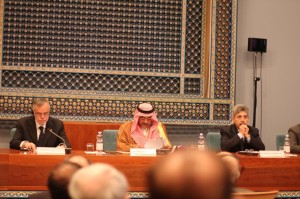 L’attesa del Presidente Nella Moschea il fermento è vissuto con molto ordine. Mentre un addetto alla sicurezza coordina giornalisti ed operatori, saluto il fotografo Stefano Romano e l’editrice Sabrina Lei che mi vengono incontro raccontandomi la fatica di tenere qualche posto in più. Ci avviamo nel salone conferenza, nella quale entro per la prima volta. La sala scende verso la lunga scrivania dei relatori, sono già tutti seduti. Copricapi di ogni tipo creano giochi di forme, varietà che diviene ancor più interessante per il colore della pelle e i tratti somatici che sembrano abbracciare il mondo intero, con una rappresentante d’onore per il Giappone, la moglie del maesto sufi Pallavicini. Ci sono tutti gli amici della rivista Piuculture: il marocchino Aziz Darif, factotum del Centro, Ejaz Ahmad mediatore culturale e giornalista pakistano, Luigi de Salvia presidente di Religions for peace, Paola Piva la presidente dell’associazione Piuculture, gli imam di Roma, alcuni venuti anche da altre città, come Abd al-Washid Pallavicini, maestro sufi arrivato da Milano per l’occasione. Ed ancora gli ambasciatori di tutti i paesi arabi, asiatici e africani a maggioranza musulmana come Indonesia, Malesia, Uganda, Palestina, Egitto. Annunciato dai due corazzieri che si dispongono ai lati della sala come di rito, arriva Napolitano. Si alzano tutti per rispetto e per immortalare con foto e video l’evento storico. Napolitano si siede nel posto d’onore e si mette in ascolto.