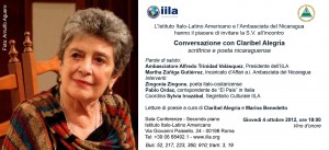 Parole di saluto: Ambasciatore Alfredo Trinidad Velásquez, Presidente dell’IILA e Martha Zúñiga Gutiérrez, Incaricato d’Affari a.i. Ambasciata del Nicaragua. Interventi: Zingonia Zingone, poeta italo-costaricense e Pablo Ordaz, corrispondente di “El País” in Italia. Coordina Sylvia Irrazábal, Segretario Culturale IILA. Letture di poesie a cura di Claribel Alegría e Marina Benedetto. Vino de honor.