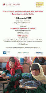 Il Film Festival Senza Frontiere – Without Borders e la Commissione delle Elette presentano il 15 Gennaio 2013 presso la Casa del Cinema di Roma – Largo Marcello Mastroianni 1 – Buddha Collapsed out of Shame per la regia di Hana Makhmalbaf, alle ore 17.30 in Sala Deluxe. Segue alle ore 19 una tavola rotonda e dibattito con il pubblico dal titolo Tutte a scuola presieduta da Monica Cirinnà – Presidente Commissione delle Elette – con Padre Caesar Atuire – sacerdote della Diocesi di Roma, nato in Ghana e fondatore di Amicus, associazione italo-ghanese di cooperazione e volontariato internazionale nel campo della promozione umana e dell’educazione allo sviluppo – e Parisa Nazari iraniana dell’associazione Donne per la dignità e condotta da Iman Sabbah, giornalista arabo-israeliana di Rai News.