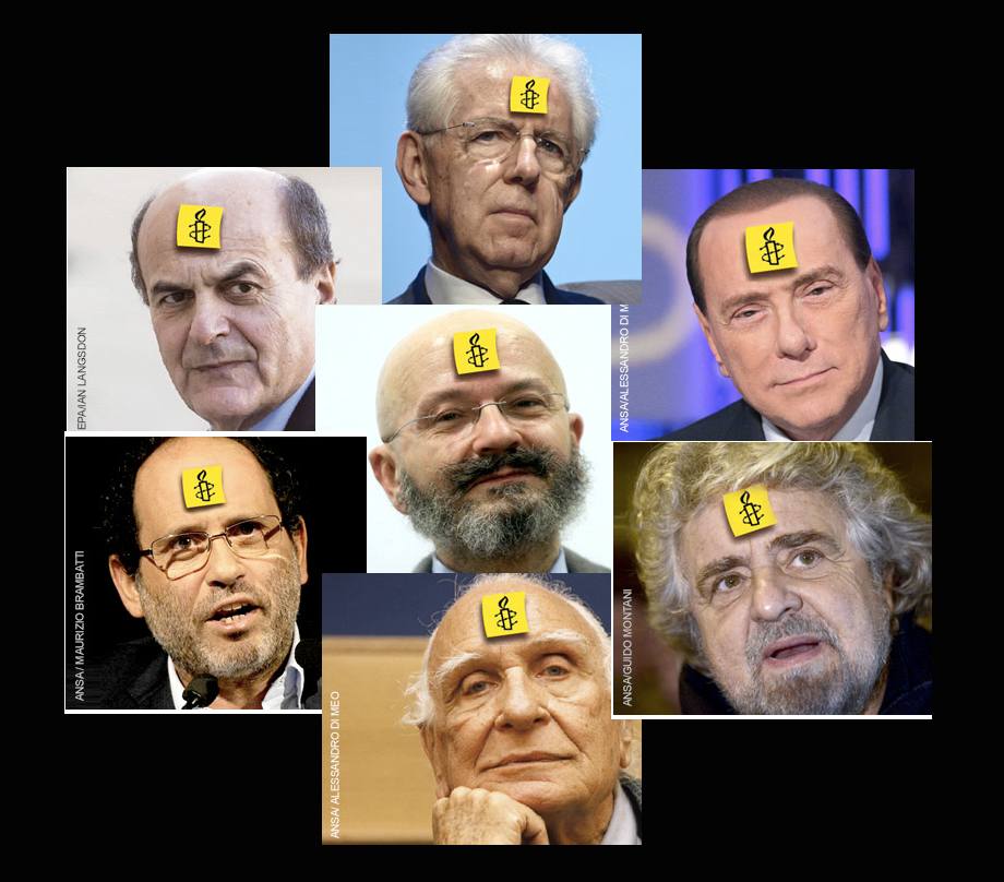 Amnesty alza la voce e invia ai candidati Berlusconi, Bersani, Giannino, Grillo, Ingroia, Monti, Pannella una mail con i dieci punti di Ricordati che devi rispondere. Dieci aspetti, i più critici e importanti, sui quali è ora che l’Italia attui degli interventi. “Sono singole richieste concrete e le risposte dovranno essere Si o No, vaghezza o rinvii non sono ammessi” dichiara Weise. “La nostra sarà una campagna concreta e costante, vogliamo consapevolezza e trasparenza”.