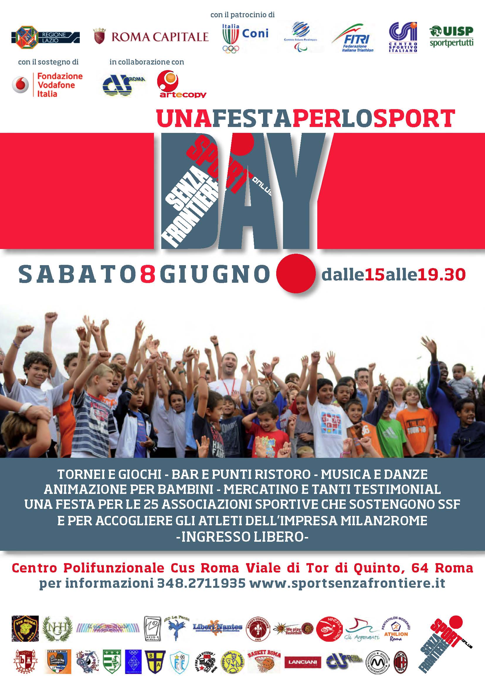 Lo Sport Senza Frontiere day dell’8 giugno 2013 dalle 15 alle 19.30 presso il Centro Polifunzionale CUS a Roma in Via delle Fornaci di Tor di Quinto, 64, vuole essere una giornata che si pone come un ulteriore step del percorso sportivo iniziato ad ottobre. Il direttore responsabile Sandro Palmieri, orgoglioso dei risultanti, afferma, “sarà una giornata d’integrazione ed inclusione sociale“.