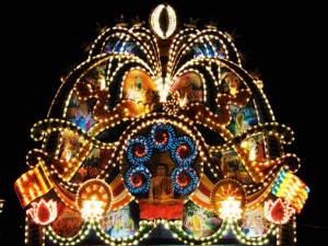 Il pomeriggio sarà dedicato a fiori, offerte e luci. “I fedeli porteranno fiori in offerta al Buddha e ogni anno organizziamo un’asta di beneficienza per sostenere le attività del centro mettendo in palio un cesto floreale. I membri delle varie comunità buddiste presenti a Roma hanno sempre partecipato con entusiasmo: si parte da cifre contenute ma i rilanci arrivano fino a 700-800 euro. La gente dona molto volentieri”. E mentre le donne sono impegnate nella preparazione del menù alcuni uomini lavorano alla costruzione del pandal, una struttura di legno alta circa 4 metri composta da cilindri rotanti sui quali saranno alloggiate delle lanterne: “L’accensione delle lanterne nella tradizione del Wesak illumina l’anima del Buddha, per questo nello Sri Lanka in questo periodo è usanza appenderle fuori dalle case”.