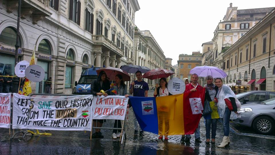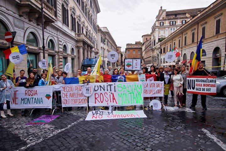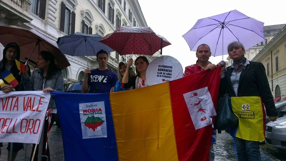 Uniti, salvam Rosia Montana! Cu acest slogan continua manifestarile de protest in toata Romania si in capitalele europene pentru a salva Rosia Montana, a impiedica exploatarea aurului cu cianuri si a bloca legea in favoarea proiectului care poate distruge minele. Concomitent cu Milano si Torino, a fost organizat si la Roma un protest pe 15 septembrie, intr-o duminica ploioasa care a adunat in piata de la orele 14.00 la 20.00 in jur de o suta de persoane din diaspora romana si moldoveneasca. In timp ce in Romania si in alte orase protestatarii au revendicat demisia Primului Ministru Ponta si a autorilor propunerii de lege, cerandu-le sa respinga acordul proiectului minier, interzicerea mineritului cu cianura si includerea localitatii Rosia Montana in patrimoniul UNESCO, la Roma participantii nu vor caderea guvernului roman. “Noi avem incredere in actualul guvern si speram ca vor gasi cu multa diplomatie solutia justa”, declara Mioara Moraru, asociatia Propatria, una dintre organizatoarele protestului, care a si informat Ministerul de Externe prin intermediul Ambasadei Romaniei despre intentiile pacifice ale manifestatiei. “Luand o pozitie in primul rand impotriva legii care va permite dezvoltarea proiectului, suntem solidari cu cei care au iesit in strada in patrie. Daca va fi aprobata, va deveni o pata neagra in istoria Romaniei deoarece pune in pericol viata fiilor nostri, viitorul tarii, bogatiile pamantului. Acest loc nu poate fi distrus: pentru toate valorile culturale si artistice detinute ar trebui sa devina patrimoniul UNESCO”. Mioara considera un factor pozitiv faptul ca o cauza nobila precum salvarea Rosiei Montana a reusit sa uneasca si sa adune in strada romanii din toata lumea.