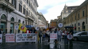 “Acest proiect ar oferi astazi locuri de munca locuitorilor si acesta ar fi latul pozitiv, dar ce vor face acestia peste 2-3 ani? Vor deveni someri?”, zice Irina, o ingrijitoare originara din acea zona. “Este una dintre cele mai frumoase zone ale Romaniei, ar fi un pacat sa fie distrusa. Am plecat de acolo din lipsa unui loc de munca, altfel nu am fi lasat in urma acel paradis,” adauga Natalia, o consateanca a Irinei. Protestul condamna atitudinea ezitanta a politicienilor romani ce sunt in cautare de solutii pentru legiferarea proiectului minier in favoarea companiei canadiene. E de apreciat faptul ca la Roma au iesit in strada o multime de intelectuali care nu au ramas indiferenti. Ar fi venit si multe persoane simple daca ar fi fost mediatizat mai bine cazul.