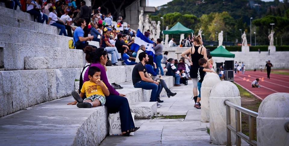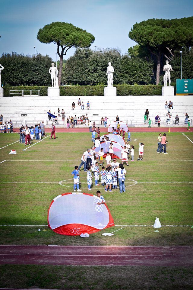 „La squadra dell’Eritrea non si è presentata perché c’è chi ha perso cugini e parenti a Lampedusa nei giorni scorsi. Un minuto di silenzio va alla loro memoria”, con queste parole dell’organizzatore Massimo Morezzi è iniziata la 5° festa del torneo Millecolori, il 13 ottobre allo Stadio dei Marmi di Roma, messo a disposizione dal CONI. Abbracciati e dispiaciuti della tragedia, i piccoli calciatori dai 5 ai 9 anni hanno regalato un breve pensiero ai migranti. E poi si sono dedicati al gioco, nella splendida giornata di sole: l’importante è partecipare, stare bene con i compagni di diverse nazionalità, senza badare alla loro provenienza o al colore della pelle. Le squadre hanno sfilato come alle olimpiadi davanti a un pubblico di più di mille persone, accompagnate dal inno nazionale, sotto alle bandiere, nei vestiti tradizionali. Ogni squadra – con la nazione scritta sul completo indossato – ha giocato partite di 10 minuti. Per oltre due ore si sono scontrati sul campo diventato multicolore, nella gioia di dimostrare chi è più forte. „Dovevamo arrivare a 30 squadre, ma siamo contente di aver raggiunto le 26. E’ una festa d’integrazione: non guardiamo la bravura, giocare e divertirsi insieme – questo è il significato. Far uscire dal ghetto tutte le nazioni che vivono chiuse a Roma, parlare con bambini stranieri e assaggiare il cibo preparato dalle loro mamme”.