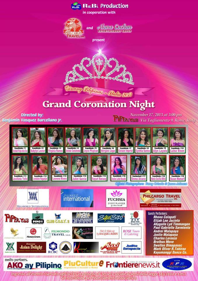 Le partecipanti sono diciannove: alcune si presentano al pubblico in tagalog, molte in inglese, qualcuna in italiano. Avanzano sfilando fino al centro del palco: una breve frase e via, lasciando il posto alla concorrente successiva. C’è chi si dice fiera delle sue radici, chi racconta tutto sui suoi figli, chi pone l’accento sulla sua laurea. La più giovane ha 34 anni ed è mamma di quattro bambini. Ma c’è anche un’“orgogliosa nonna di cinque nipoti e mamma di quattro”, che suscita l’ilarità generale quando dimentica di annunciare al pubblico proprio la cosa più importante: il suo nome. Ci sono quattro infermiere, una dentista, una candidata alle elezioni regionali, tante collaboratrici domestiche. Vivono tutte a Roma.