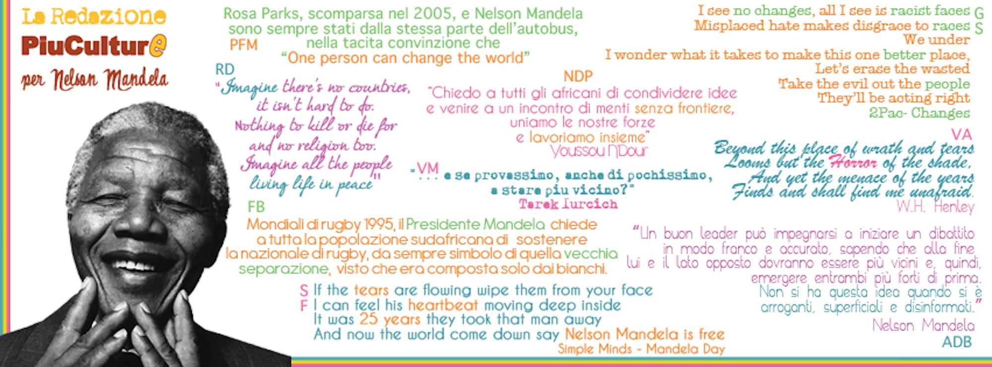 Il giorno dopo i funerali di Nelson Mandela in Sudafrica, noi della Redazione abbiamo deciso di ricordarlo, ciascuno con un proprio pensiero. C’è chi ha scelto una canzone, chi una poesia, chi un episodio legato alla sua vita. Ciò che ci preme, comunque, è mantenere vivo il ricordo di un uomo di cui condividiamo la visione del mondo e di cui cerchiamo, ogni giorno e nel nostro piccolo, di portare avanti l’esempio.