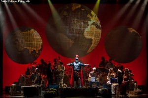 Una valigia, una canzone e uno strumento, di questo ha bisogno un musicista per imbarcarsi sulla zattera, per fare Il giro del mondo in 80 minuti 2014 con l’Orchestra di Piazza Vittorio, direzione musicale e artistica Mario Tronco. Lo spettacolo, dopo il grande successo della passata stagione, torna tra il 21 e 26 gennaio al Teatro Olimpico, con la sala piena tra tanti applausi e bis, arricchito dalla presenza di un ospite d’onore: Luca Barbarossa, un romano che viene a chiedere soccorso all’orchestra per riconquistare con una serenata l’amore della donna che ha tradito. „Un show autobiografico ed una struttura aperta dove si possono inserire ogni volta nuovi elementi in coerenza con il racconto. Quest’anno ci sono altre canzoni che narrano storie diverse”, spiega Mario Tronco. L’80% dello spettacolo è rimasto uguale, per la scenografia firmata Daniele Spanò si utilizza una tecnologia con delle scene virtuali. Le 3 lune rappresentano stati d’animo sia interiori che esteriori: „Mostriamo tanta umanità, ci mettiamo molto a nudo, addirittura in maniera imbarazzante perché raccontiamo in prima persona”. La grande presenza di bambini sia nel pubblico che tra i musicisti – sono coinvolti nello spettacolo attraverso la body percussion dal Maestro Ciro Paduano e i giovani allievi della Scuola Popolare di Musica Donna Olimpia – viene offerta una caramella all’entrata ad ogni persona per eseguire una canzone insieme usando lo struscio della carta. „Far parte di un’orchestra è una cosa molto complicata, bisogna rinunciare a qualcosa di se stessi per l’arte. Ogni musicista sente il progetto suo perché ha un momento da protagonista. Non vedo dentro di loro la geografia, per me sono degli amici, fratelli. La maggior parte ha portato delle cose diverse ed importanti ed io spero di aver dato qualcosa a loro. Il nucleo ha ragione di essere quando tutti danno qualcosa per un risultato finale”. Tronco non capisce perché gli artisti vengono chiamati stranieri quando all’estero gli italiani sono chiamati italo-americano, italo-francese, italo-canadese. Con la crisi allargare l’organico è difficile, ma nonostante ciò, cercano nuovi giovani artisti appena arrivati dal loro paese, con voci, strumenti particolari che facciano parte della loro tradizione popolare.