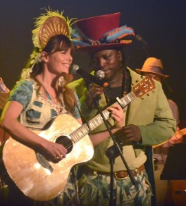 „Lavorare con le persone di culture diverse è come fare un corso di musiche del pianeta, girando per tutto il mondo in una stanza sola”, parla Sylvie Lewis, la cantante protagonista di origini inglesi. Dopo aver viaggiato tanto e vissuto a Londra, in Sud Africa, a Boston, Los Angeles, Barcelona, è arrivata in Italia 7 anni fa. Sono stati i membri dell’orchestra a scoprirla ed a invitarla a collaborare: „Ho beccato questo gruppo di pazzi meravigliosi, che mi hanno chiesto di fare il ruolo di Pamina ne Il flauto magico. Sono rimasta in pigiama nel mio attico per 10 giorni per realizzare il ruolo, scrivere due pezzi, così mi hanno accettato”. Sylvie ha avuto la fortuna di studiare composizione e song writing all’università di musica a Boston, poi ha realizzato tre dischi negli Stati Uniti, però cercava un’opportunità per crescere artisticamente e personalmente. Nello spettacolo Il giro del mondo in 80 minuti ha un ruolo di ragazza romantica e il suo contributo è la musica folk: „La cosa bella di Mario Tronco è che riesce a tirare fuori l’essenza di ogni musicista, a far emergere un po’ della loro personalità dentro la musica, ci dà la possibilità di essere noi stessi”. Stufa di portarsi dietro nei viaggi la chitarra, Sylvie suona il pianoforte e l’ukulele (la pulce che salta in aria), un piccolo strumento hawaiano.