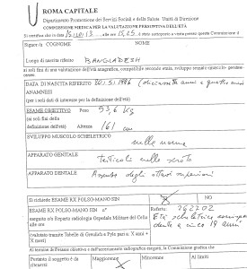Con il secondo dei certificati medici sotto mano, quello del Celio, mano Carlo Bracci ci indica quelli che sono i suoi dubbi. Il certificato riguarda uno degli oltre cento immigrati del Bangladesh sottopoti a secondo accertamento. “Attenendomi strettamente a questo documento, posso rilevare che non è riportata la presenza dell’interprete o la buona conoscenza di una lingua veicolare da parte del ragazzo (ad es inglese). Non c’è riferimento al consenso informato alla visita e all’esame radiologico. Non è descritto lo sviluppo pilifero. Non è esaustiva la descrizione legata al parametro dei genitali. L’età scheletrica è valutata a circa 19 anni, senza indicazione della fascia di variabilità. Il giudizio definitivo di maggior età ripete la diagnosi radiologica senza indicare anche qui la fascia di variabilità come richiesto dal Consiglio Superiore della Sanità”.