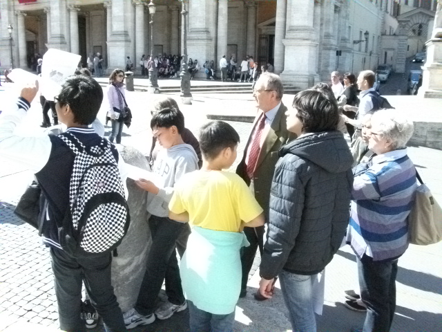 Il giro prosegue fra capisaldi dell’architettura della capitale: palazzo Spada, piazza Farnese, Campo de’ Fiori e piazza Navona, un percorso studiato ad arte per mantenere vivo l’interesse dei ragazzi con alcune chicche ed aneddoti che non possono non stimolarli, a partire dalla galleria prospettica del Borromini a palazzo Spada. Evidente lo stupore dei sei giovani studenti nello scoprire l’illusione di profondità che questa dà, pur lunga appena nove metri e l’impressione che la statuetta sul fondo, calco di un guerriero di epoca romana, sia più alta della media delle persone, mentre in realtà arriva a malapena ai fianchi della guida.