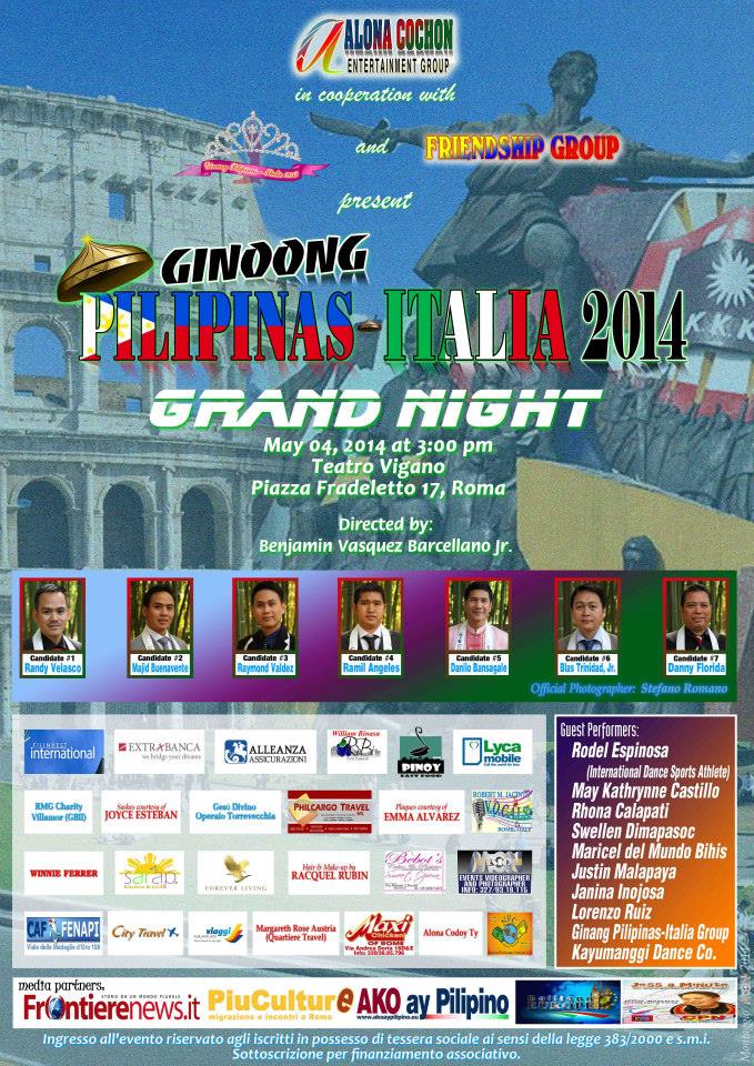 Che la comunità filippina di Roma avesse una vera passione per i talent show si era capito fin dai tempi di Batang Idol e Ginang Pilipinas, i due spettacoli andati in scena con la regia di Benjamin Vasquez Barcellano Jr. I due eventi, che hanno visto la partecipazione di un gran numero di bambini prima e di miss poi, devono aver incredibilmente incuriosito anche il cosiddetto sesso forte, che a distanza di qualche mese ha deciso di mettere da parte la timidezza e calcare finalmente le scene di Ginoong Pilipinas 2014, show “al maschile” prodotto dall’Alona Cochon Entertainment Group, in cooperazione con Ginang Pilipinas – Italia Group e il Friendship Group di Roma, che arriva direttamente dalle Filippine ed avrà luogo il prossimo 4 maggio al Teatro Vigano di Roma. Non più miss ma mister, non più donne ma uomini, non più mamme ma papà; in numero ridotto, a onor del vero, perché – parola del regista Benjamin, lo stesso degli altri due spettacoli – “lo sai, le donne sono più coraggiose…”.