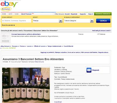 Chissà se l’azienda enogastronomica di Firenze avrà trovato i tre banconisti da impiegare made in Italy, o meglio “made in una ben precisa parte dell’Italia”. L’annuncio di lavoro apparso i primissimi giorni di aprile sul sito ebay, inserito da un locale con “prestigiosa location nel centro” – recitava il testo – richiedeva personale che non fosse né dell’Italia meridionale, né tantomeno straniero. Dopo aver richiesto esperienza nel mestiere, conoscenza dell’inglese, voglia di lavorare e passione l’annuncio riportava “No stranieri o sud Italia”.