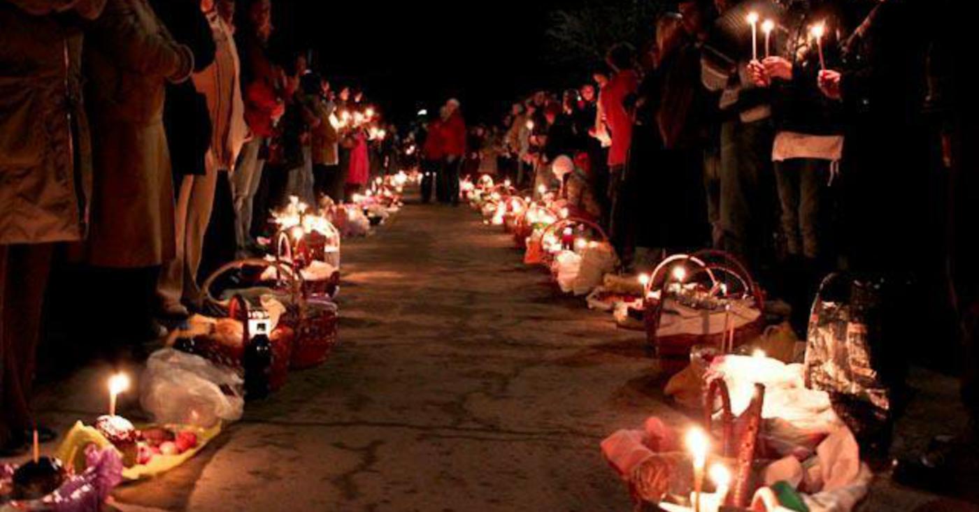 La miezul noptii toate luminile se sting iar preotul vesteste Invierea lui Iisus Cristos si ii chiama pe credinciosi sa ia lumina de la lumanarea lui care este aprinsa. Slujitorii aprind pe rand lumanarile, dand flacara din om in om. Incepe apoi, liturghia de Paste care poate tine pana la ora 5.00, urmata de sfintirea mancarurilor aduse, care de obicei se consuma dimineata si sunt oferite saracilor pentru sufletul celor morti. Traditia spune ca duminica, inainte de a pleca la slujba, crestinii ar trebui sa-si spele fata cu apa in care a stat un ou vopsit, o urzica si o moneda, pentru a fi frumosi, bogati si sanatosi. Acestia imbraca haine noi, simbol al purificarii sufletului si corpului, iar persoanele care se intalnesc se saluta cu: “Cristos a inviat!” la care se raspunde “Adevarat a inviat!”.