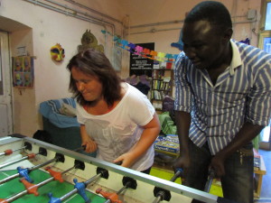 Mama Africa„Ho capito che voglio fare il volontariato, è importante sapere come aiutare gli altri. Sono arrivato in Italia minorenne, dopo lo sbarco in Sicilia, 9 mesi fa, mi sono trasferito in un centro accoglienza di Roma, dove ho studiato l’italiano superando gli esami per i livelli A1 e A2. A detta degli insegnanti sono sveglio, così mi hanno suggerito di fare la terza media, poi ho seguito un corso di aiuto barista-cameriere”, a parlare è un campione senegalese di Babi (Calcio Balilla) che ha lanciato la sfida per il gioco ai presenti. Anche lui cerca lavoro per saldare i debiti che ha contratto per pagare il viaggio in Italia. Nello stesso pomeriggio, dopo la esposizione della “bandiera” del volontariato, è stato lanciato il torneo di giochi da tavolo con i ragazzi del giovedì della zucca.