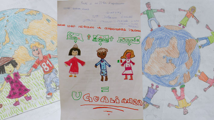 I bambini hanno disegnato la società che vorrebbero: dove l’amicizia e l’uguaglianza non sono più ostacolate da pregiudizi e leggi che impediscono ai loro compagni di fare sport, viaggiare, sentirsi a casa nel paese dove sono cresciuti. Sul retro dei fogli la petizione scritta dai piccoli per chiedere al Parlamento di riconoscere ai bambini nati o cresciuti in Italia il diritto di cittadinanza.