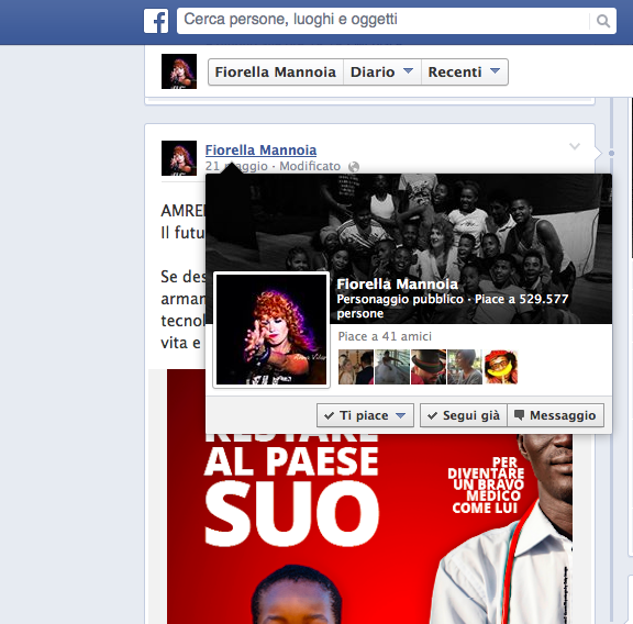 Entriamo nel vivo del dibattito 2.0 da un osservatorio particolare: la pagina facebook di Fiorella Mannoia. La cantante ha rilanciato la campagna Amref il 21 maggio. Dopo tre settimane il suo post fa ancora discutere e movimenta la rete: oltre 300 commenti, quasi 4000 condivisioni e più di 6600 likes.