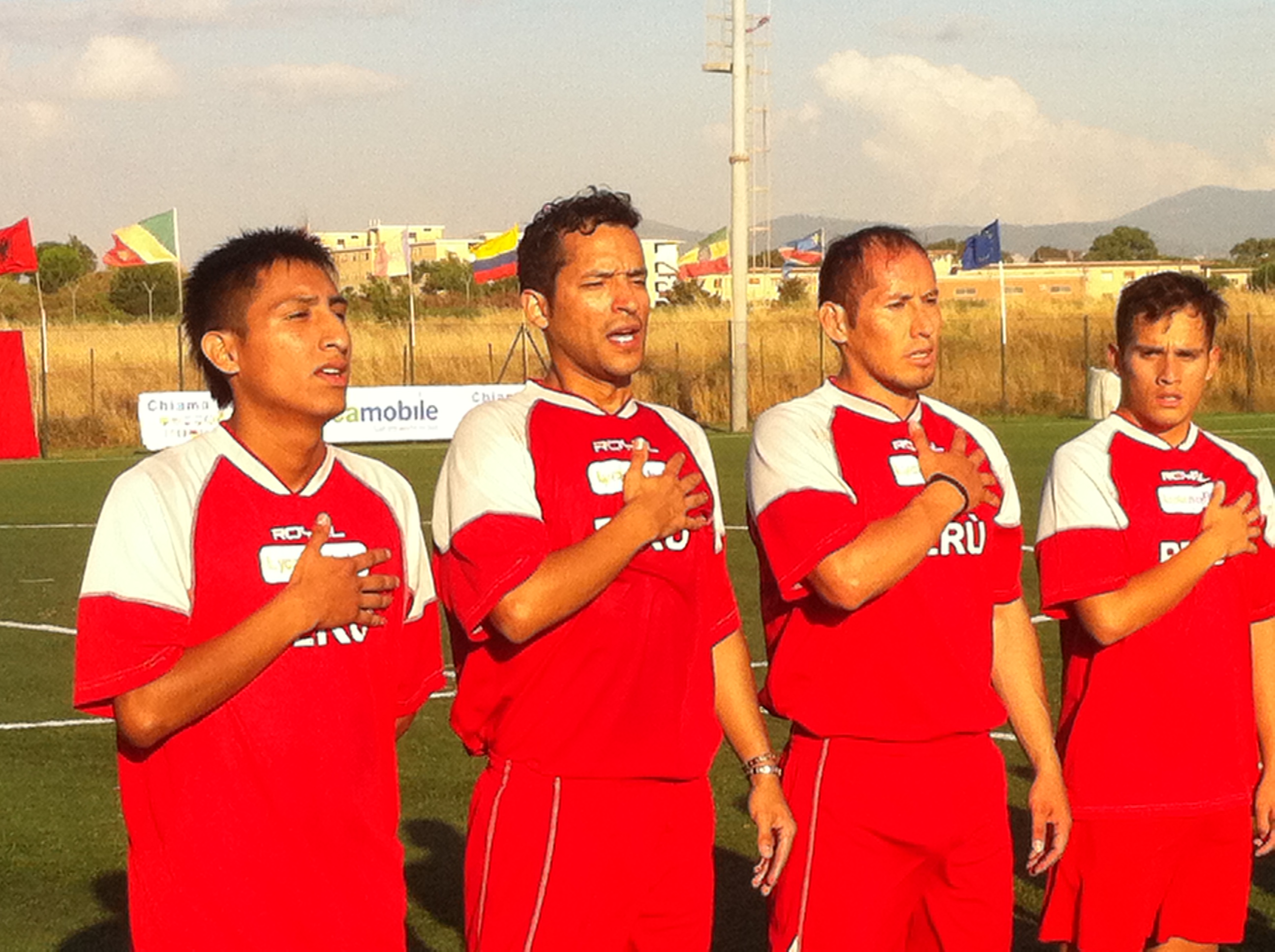 Gli spalti dell’Atletico 2000, campo che ospita ormai regolarmente la competizione, si sono riempiti velocemente dando a tutti gli effetti inizio alla battaglia sportiva. Più numerosi i peruviani, che hanno incessantemente supportato i propri beniamini con trombette e percussioni sin dal riscaldamento, mentre i romeni, inizialmente più pacati, hanno atteso il fischio d’inizio. Le squadre si sono schierate in campo rispettivamente con un 4-2-3-1 che tante gioie ha regalato a mister Beca e con un 4-3-3 molto offensivo. I primi minuti di gioco hanno regalato poche emozioni con le squadre molto contratte ed attente a non subire le sortite avversarie. I primi tentativi sono di marca sud americana ma Marcu, giovanissimo estremo difensore romeno, si fa sempre trovare pronto. Un equilibrio quello della prima mezz’ora che, come nel calcio dei professionisti, può essere sbloccato da un episodio, ed è proprio al 32′ che la partita potrebbe cambiare. Grande progressione sulla fascia di Noriega Garcia che crossa verso il centro dell’area trovando l’opposizione di mano di un difensore rumeno. L’arbitro fischia la massima punizione senza pensarci troppo e sul dischetto si presenta Lopez giovane funambolo classe ’91. La tensione è massima al momento del calcio, anche i tifosi sud americani, fino a quel momento inarrestabili, trattengono il fiato. Lopez calcia ma con un tuffo degno del miglior Buffon, Marcu para. Il risultato rimane inchiodato sullo 0-0 ma psicologicamente l’inerzia sembra cambiata.