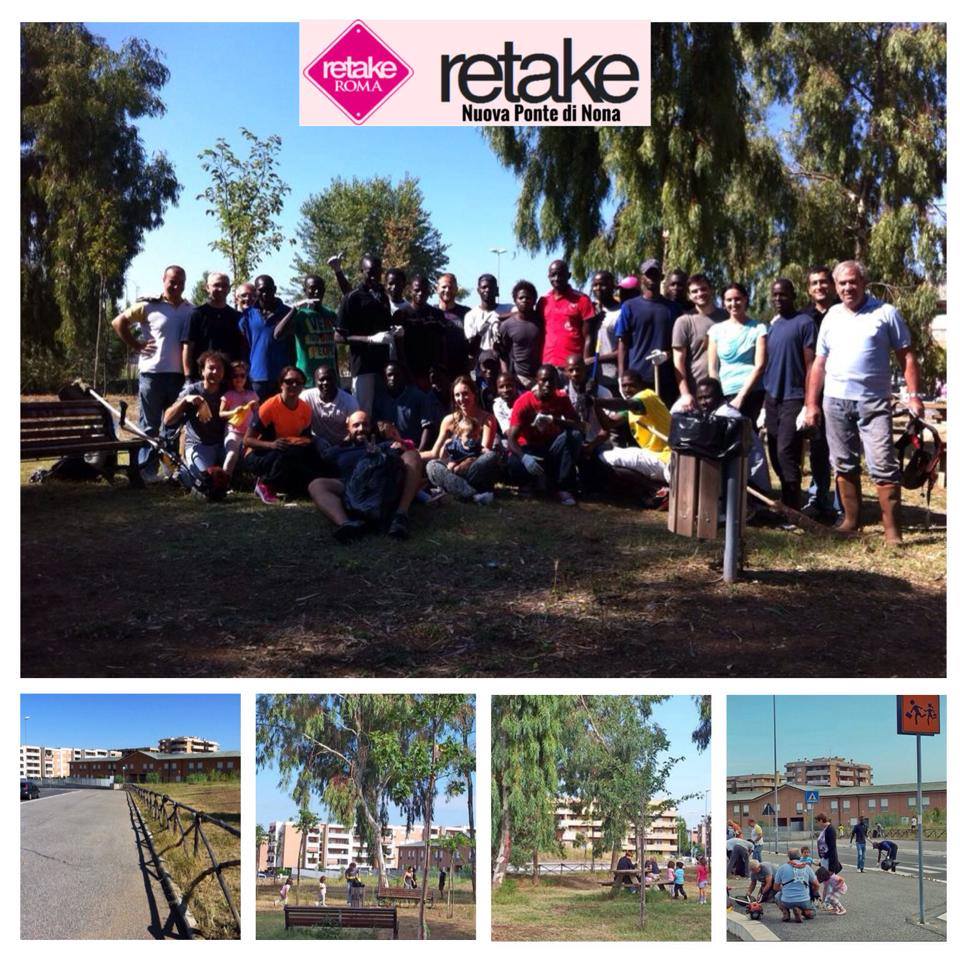 Sono circa quaranta i gruppi Retake che operano a Roma divisi per zone. Tra questi c’è anche quello organizzato dal Comitato di Quartiere Nuova Ponte di Nona, nato di recente ma già operativo e – soprattutto – salito agli onori della cronaca per aver dato vita ad un Retake decisamente sui generis. “Un lunedì ci siamo incontrati per un Retake nel quartiere ed abbiamo notato un ragazzo che rovistava nei cassonetti: veniva dal vicino centro per rifugiati (il “Namaste”, ex hotel di via Grappelli gestito dalla cooperativa ABC, ndr). Appena ci ha visti ci ha guardati in modo un po’ strano. Poi però si è avvicinato, si è unito a noi e ha iniziato a darci una mano”. A parlare è Francesco Ortolani, che insieme a Bruno Foresti – entrambi membri del Comitato – ha avuto così l’idea di coinvolgere alcuni ospiti del Centro per l’incontro di sabato 13: “In strada eravamo una settantina: 20-25 membri del movimento e 40-45 rifugiati. Insieme abbiamo pulito le strade intorno alle scuole del quartiere, per renderle dignitose prima del rientro in classe dei bambini”.