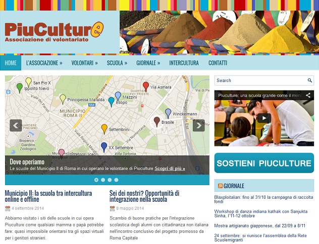 Grafica essenziale e pulita senza rinunciare al colore, organizzazione chiara dei contenuti e layout compatto fanno del sito uno strumento facilmente consultabile e accattivante per ottenere tutte le informazioni sulle attività dell’associazione e sulle opportunità di volontariato offerte, opportunamente distinte nei tre canali: scuola, giornale, intercultura. Le tre aree sono facilmente raggiungibili dal menù di navigazione e dalle immagini a scorrimento presenti in home page, che includono anche il link alla mappa che mostra tutte le scuole in cui è presente Piuculture. Nella pagina principale sono inoltre ospitati articoli che trattano i temi vicini all’associazione e, nella colonna destra, un’estrazione delle notizie pubblicate sul giornale online. Completano il sito materiali e normative utili per i volontari impegnati nell’insegnamento dell’italiano a stranieri, informazioni sulle modalità per sostenere l’associazione, contatti e link alla pagina facebook curata dalla redazione del settimanale online.