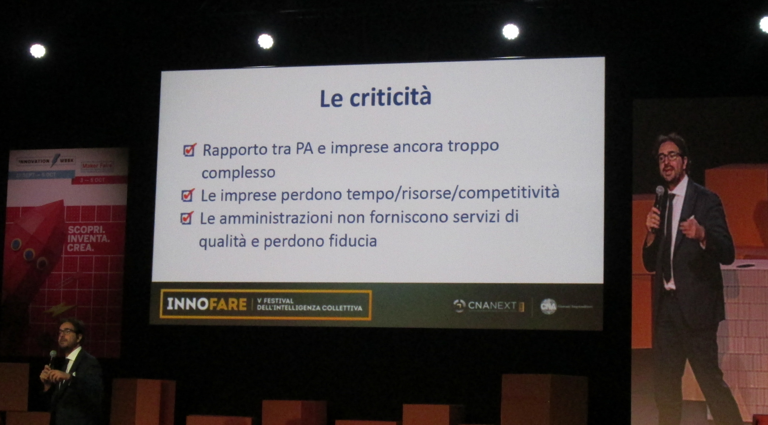 Conoscenza. Innovazione. Internalizzazione. “L’Italia non è il paese della formazione: mancano le figure di orientamento che possano indirizzare nella vita sia i giovani, sia le persone di una certa età”, sottolinea nel suo discorso il giornalista Walter Passerini nell’incontro Innofare del 5 ottobre organizzato dalla CNA Next durante la Maker Faire, la Fiera Internazionale dell’Innovazione. “C’è la frammentazione stato-regione che impedisce di fare sistema. Bisogna contrastare l’eccesso di burocrazia per le aziende, riconoscere la formazione italiana nella UE”, e conclude con la proposta di uno scambio di conoscenze e buone pratiche tra gli imprenditori con esperienza e i giovani.