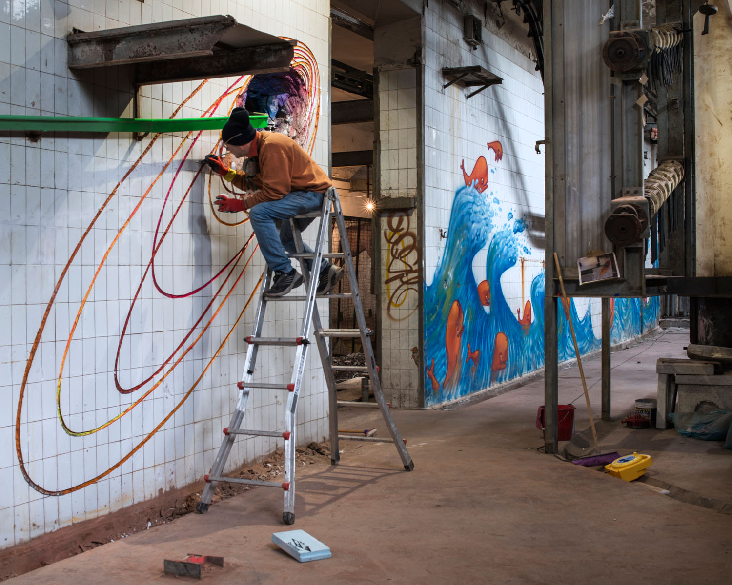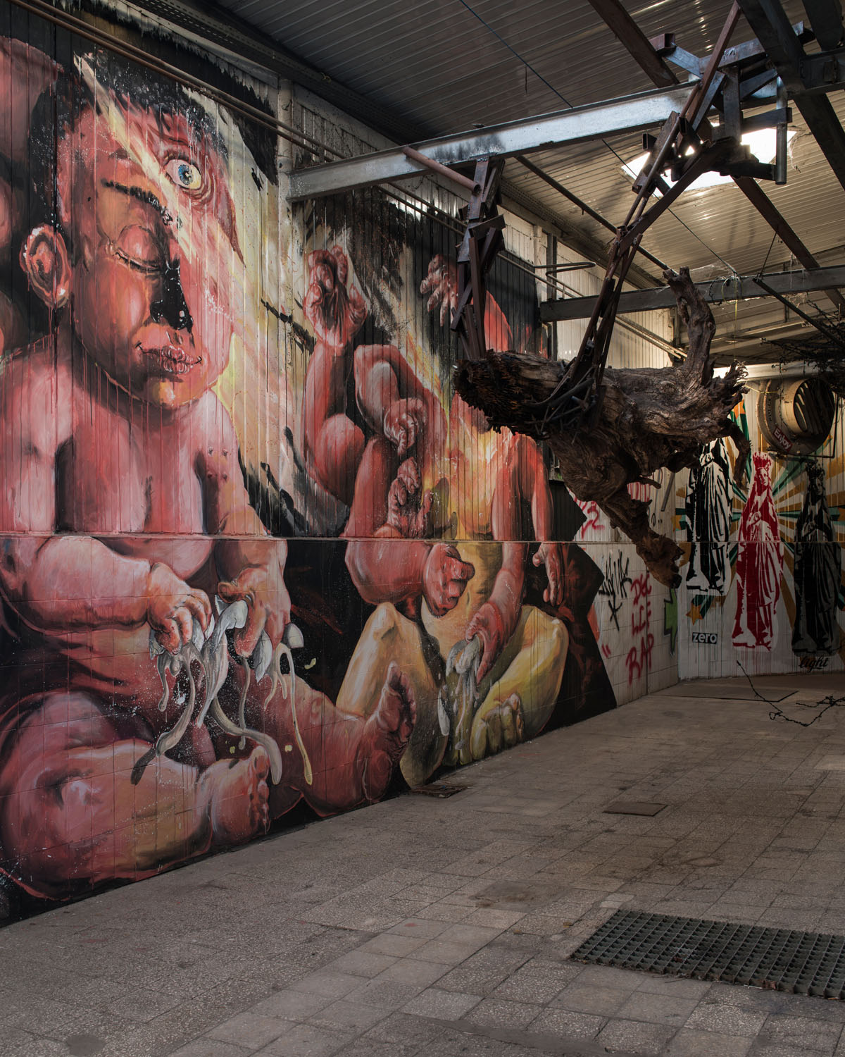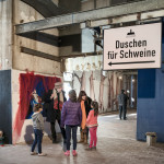 Prima si iniziava con gli animali vivi. I maiali entravano in un corridoio che si fa sempre più stretto, alla fine storditi con una pistola dalla punta di ferro e appesi per gli arti posteriori su una guidovia che procedeva verso la sala dove si eseguiva lo sgozzamento. Una volta colato il sangue, le carcasse passavano attraverso la macchina scuoiatrice, che ricorda un autolavaggio con tanto di spatole roteanti, finché si passava all’eviscerazione. Sul muro di fronte l’affresco della Cappella Porcina – eMAAMcipazione di Pablo Mesa Cappella e Gonzalo Orquín, che rivisita il percorso dei maiali nella fabbrica, ribaltandolo dalla morte alla vita. Nella sala adiacente, che ospitava le vasche di raccolta del sangue, le opere di Nicola Alessandrini e Vincenzo Pennacchi richiamano quello che queste pareti hanno effettivamente visto per anni.