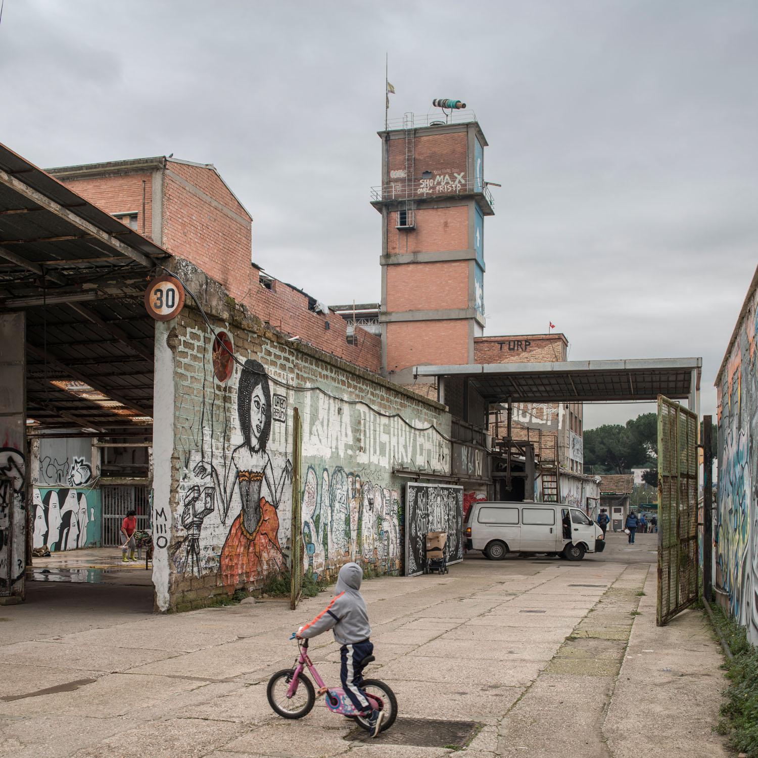 MAAM – Cortile esterno. Un bambino sulla sua bici. Sullo sfondo la torre di Metropoliz con in cima il telescopio di Gian Maria Tosatti – photo Giuliano Ottaviani