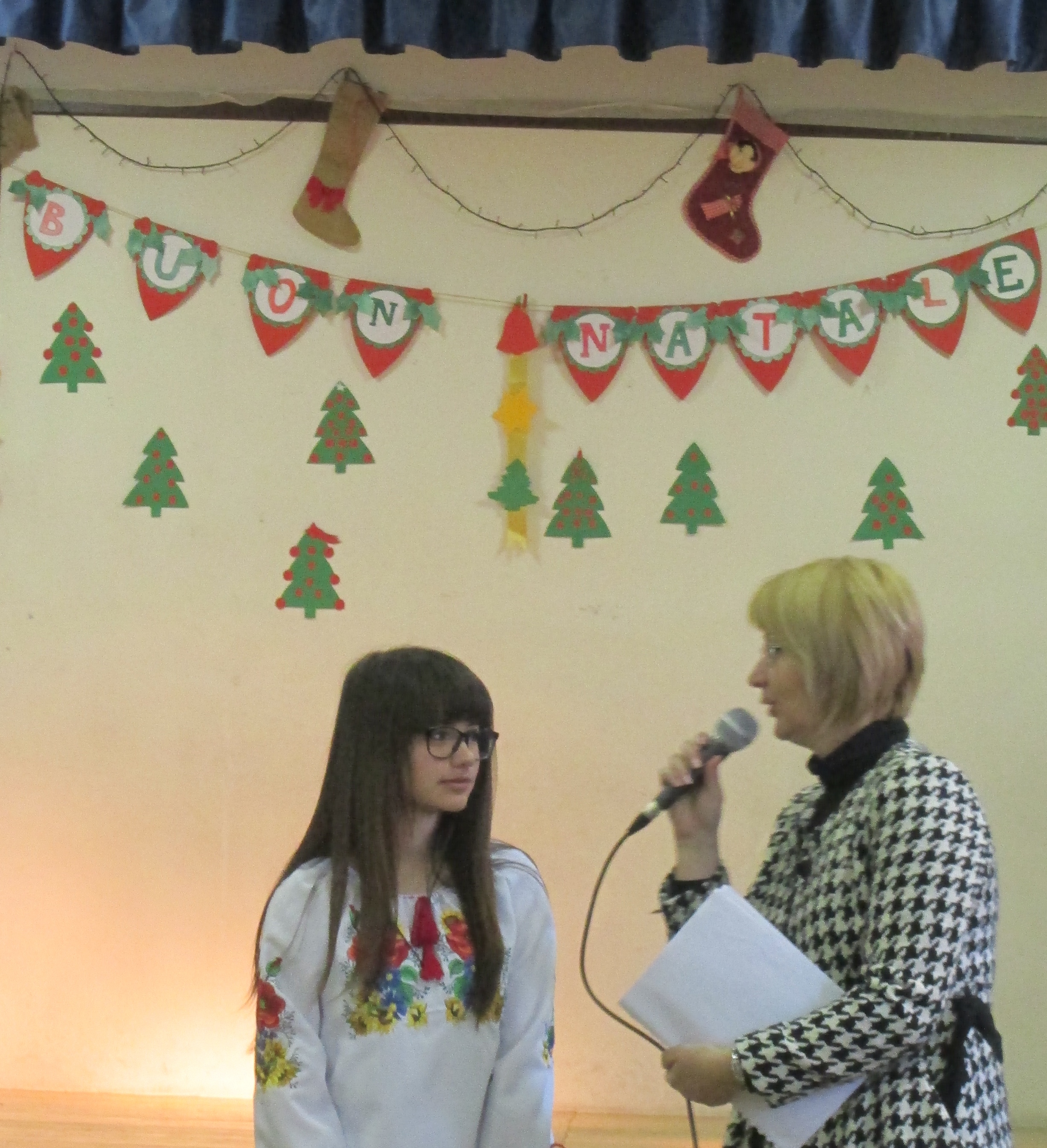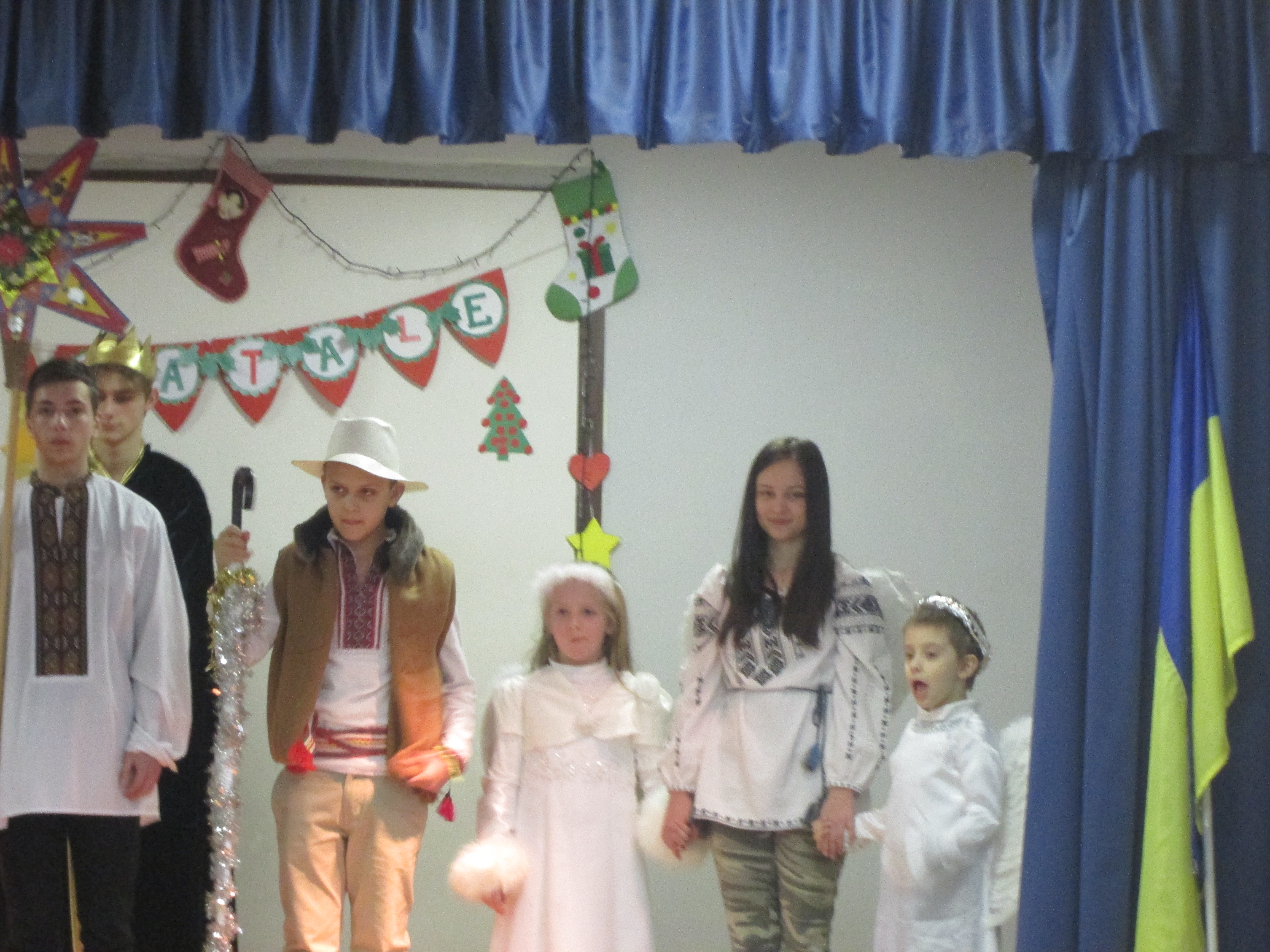 „Preghiamo per la riconciliazione e per la pace”, la preside Kuzyk annuncia l’inizio dell’evento con una preghiera in italiano e ucraino che oltre cinquanta madri con figli e papà presenti in sala hanno recitato insieme. Sotto il suono soave di un pianoforte il gruppo di personaggi: angeli, il diavolo, il re, la morte, ecc, sono saliti sul palco per presentare la storia della nascita di Gesù che hano preparato per più di un mese. E’ arrivata dai giovani l’idea di immortalare i personaggi biblici e si sono impegnati con i vestiti. „Hanno imparato le parole a memoria e io li ho aiutati a esprimersi. Hanno fatto solo due prove di persona, perchè l’associazione non ha una sede, mancata, hanno lavorato molto al telefono”, racconta orgogliosa del talento dei ragazzi Lilia. Ai bambini sarebbe piaciuto studiare la vita di Gesù dai libri, invece sono obbligati a imparare la storia di una guerra assurda dal vivo.