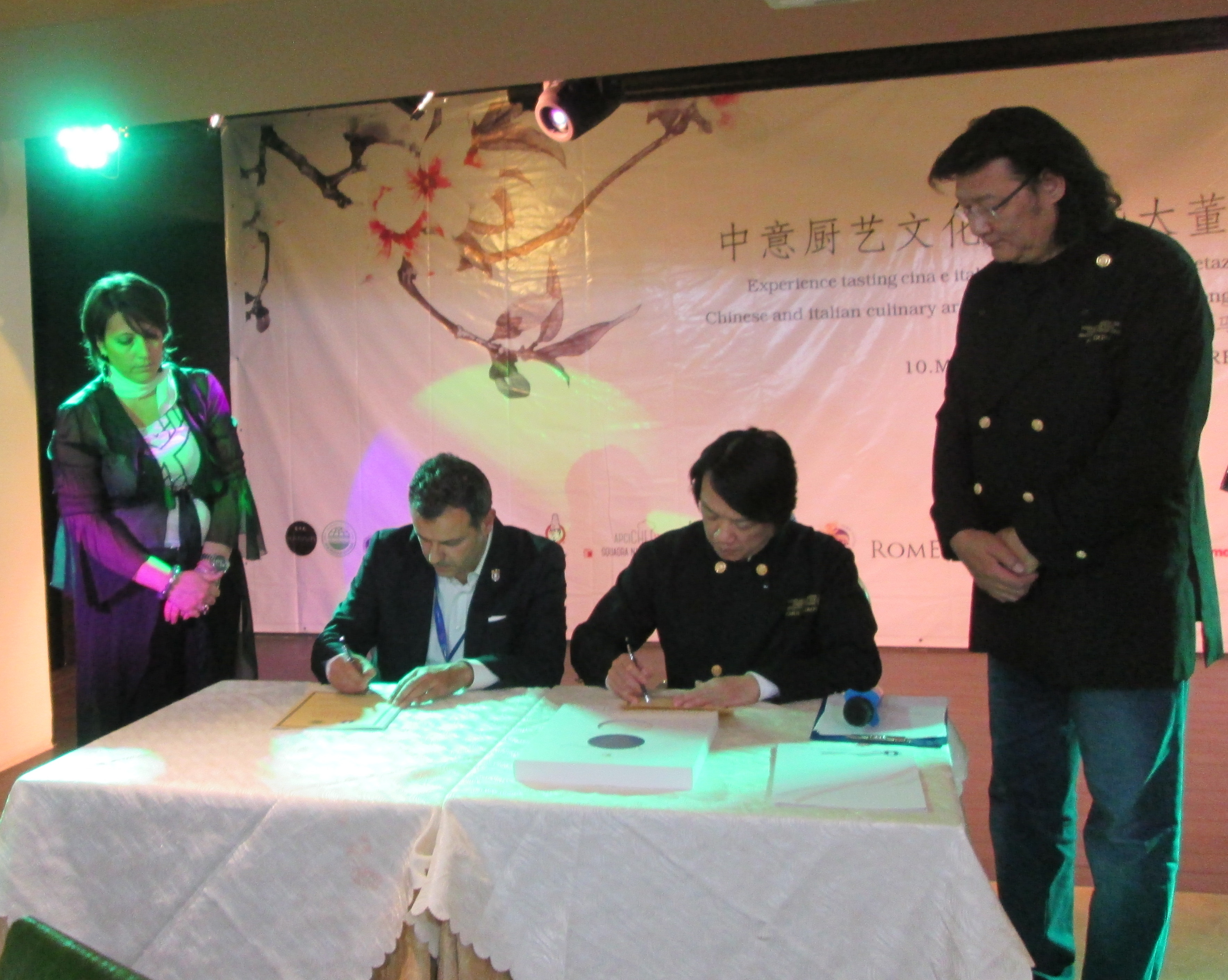 “Gusto, tradizione e creatività s’incontrano”, inizia così l’accordo firmato domenica scorsa, letto dalla direttrice dell’Apci, Sonia Re, alla presenza del presidente Roberto Carcangiu, di Marco Velletri della delegazione Lazio, di Zhou Xiaoyan dell’Associazione professionale cuochi cinesi (Apcc) e di Dong Zhen Xiang Dadong. Per la cerimonia d’interscambio culturale sono saliti sul palco i rappresentanti della Squadra Nazionale APCI CHEF ITALIA, che insieme a chef arrivati dalla Cina hanno preparato 14 piatti di grande livello, i più rappresentativi per entrambi paesi. La comunità cinese ha scambiato pareri sulla preparazione e il gusto delle prelibatezze con tanti italiani ed esponenti diplomatici, tra cui Mumtaz Kassam, ambasciatore dell’Uganda e August Parengkuan, ambasciatore dell’Indonesia. Tutto offerto con generosità da Jin Lai, il proprietario del ristorante Platinum.
