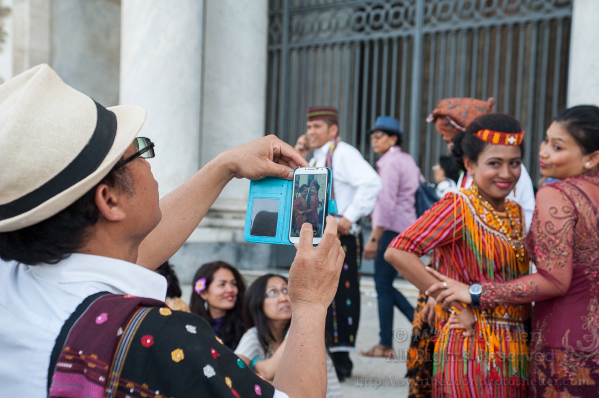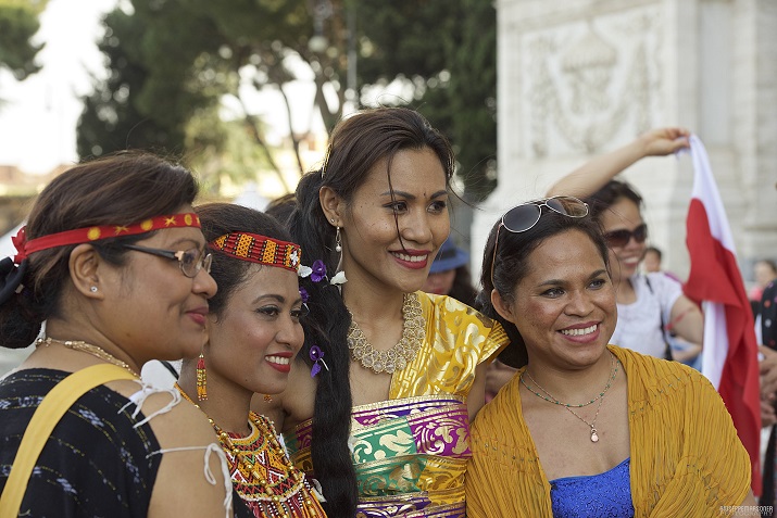 Brillano gli stand sotto il sole cocente della prima giornata estiva di Roma. Bastano dieci passi e sei nelle Filippine, ti sposti un po’ più in là e arrivi in Albania, ancora un paio di metri e sbarchi a Mauritius. Sullo sfondo di questo villaggio multiculturale l’imponenza della basilica di San Giovanni. All’entrata una grande insegna variopinta: Festa dei popoli 2015.