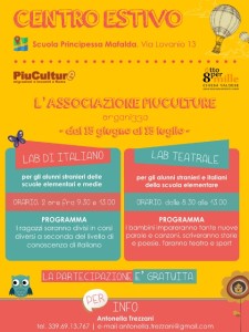L’associazione Piuculture ha iniziato le iscrizioni per il centro estivo che si terrà tutte le mattine dal 15 giugno a 15 luglio nella scuola “Principessa Mafalda” in via Lovanio, 13.