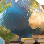 globe with stacks of books. isolated on white.