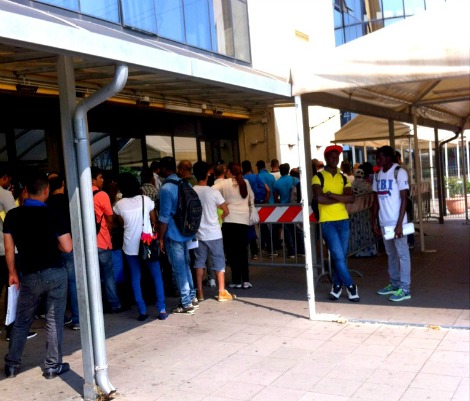 Sotto il sole che apre le porte all’estate, ci sono storie che hanno un volto e ritraggono il sacrificio, la stanchezza e la soddisfazione di essere lí. Varcato l’enorme cancello grigio, le persone con in mano cartelline di documenti, il loro biglietto da visita, sull’attenti e quasi ad evidenziare l’importanza di essere riconosciuti, comunicano con gli sguardi, tanto che conoscere l’italiano non sembra d’obbligo. Chiedono informazioni, si mettono in fila e aspettano. Si muovono in gruppi, all’unisono, sotto il ritmo così scandito dei militari di turno. Si sentono pianti di bambini nel passeggino ed il suono dei freni dell’autobus che porta altre persone per la questura.