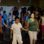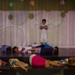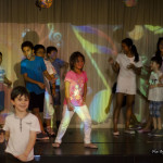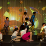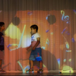 I bambini salgono sul palco per raccontare una speciale evoluzione del mondo, tutta mimata: prima il caos, poi il brodo primordiale, le amebe, i dinosauri, le piante, gli animali, e infine l’uomo, che tra i tanti difetti ha anche un pregio: aver inventato il ritmo. Le voci registrate dai bambini insieme a Matteo raccontano la storia, i disegni alle pareti la mostrano, i piccoli attori la mettono in movimento. È il principio della DanceAbility, una tecnica di danza e improvvisazione che, spiegano da FuoriContesto, nasce negli USA ma viene esportata in tutto il mondo per dare vita a laboratori sociali che vedono protagonisti bambini, disabili, adolescenti, anziani. E funziona, perché la lingua diventa secondaria, e l’espressione del corpo universale. Samir, che l’italiano lo sta imparando pian piano, comunica col corpo ed è protagonista del ballo. E lo diventano anche i genitori, trascinati sul palco dai figli al ritmo di Happy, la canzone che chiude lo spettacolo dopo quella inventata dai bambini, che ha per protagonista un lupetto che va con i suoi amici alla ricerca delle sue origini.