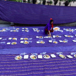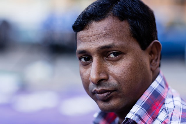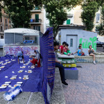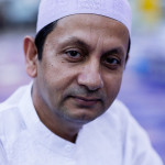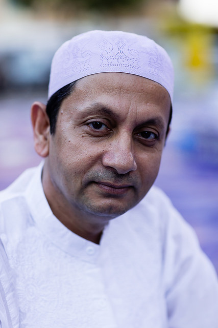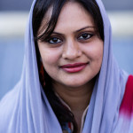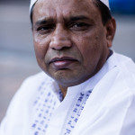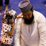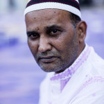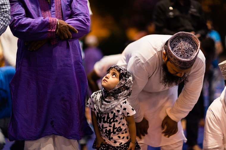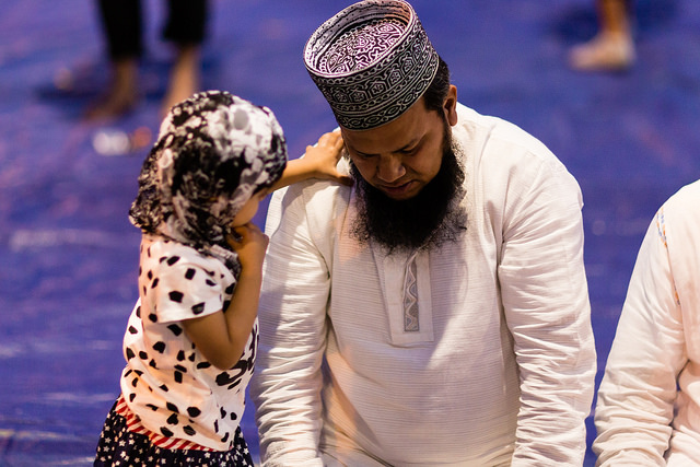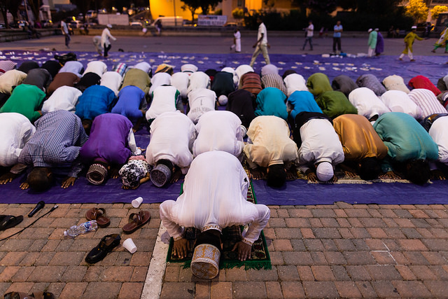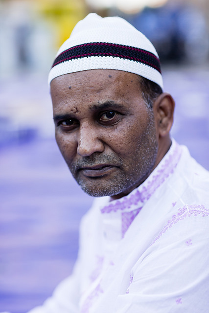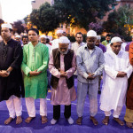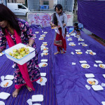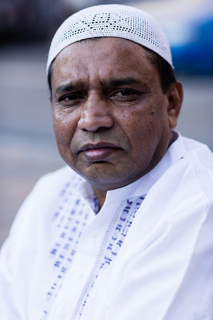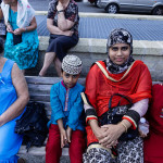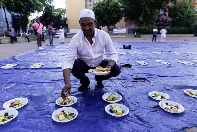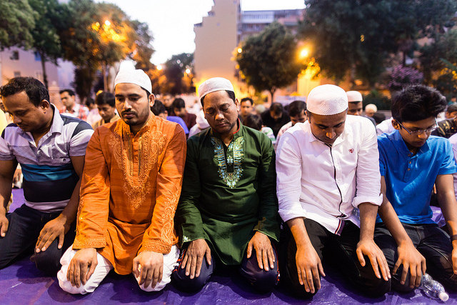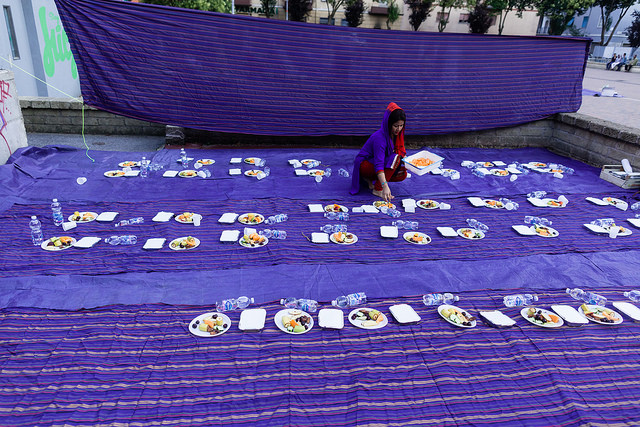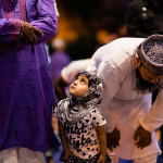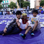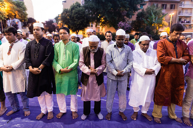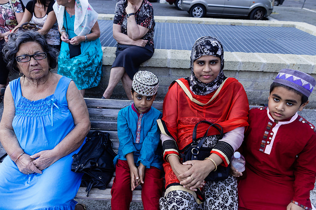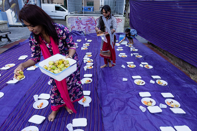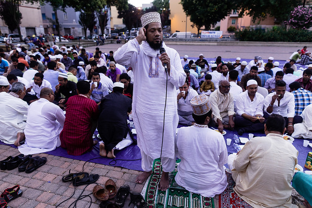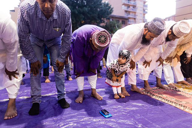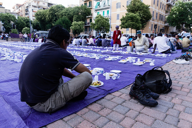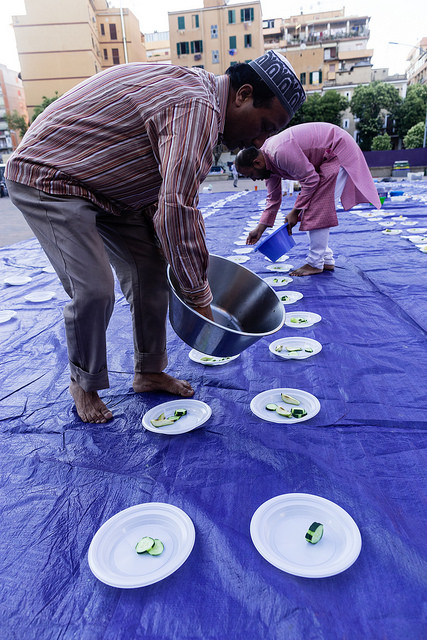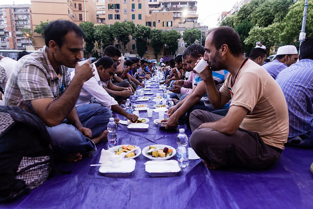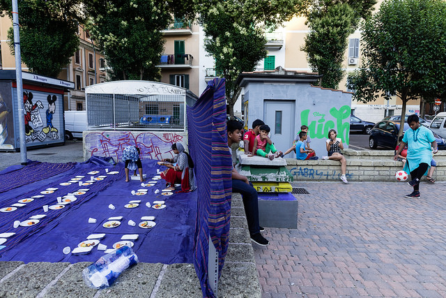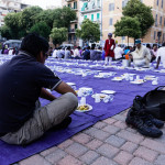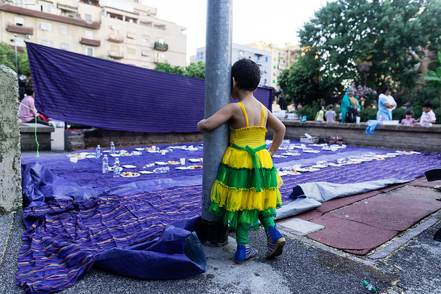 La bambina è abbracciata alla madre, nel gruppo delle donne. Mi avvicino e lei guarda la macchina fotografica, la madre mi sorride.Chiedo se posso fotografarle.Mi fai capire che non parla ancora italiano.’English?’ sperando che il mio inglese passi la prova.Mi dice che sono arrivati da sei mesi. Mi dice il nome della figlia, che non riesco a capire. Mi dice che la bambina ha due anni.Quando chiedo se posso fotografarle, di nuovo, si mette a ridere e mi dice di si.Scatto. La bambina mi fa le boccacce poi si ributta tra le braccia della madre.Intanto le altre donne ridono, mangiano, parlano.Vengono tutte dal Bangladesh, i sari colorati che le coprono fino alla testa, i bambini più piccoli le accompagnano mentre gli uomini, dall’altra parte del telo, mangiano in silenzio seduti nella piazza.E’ l’Iftar, la cena consumata durante il Ramadam che rompe il digiuno diurno.Riso, frutta, datteri. Acqua e sharbat al limone.Siamo a Torpignattara. Qualcuno del quartiere curioso si avvicina, una signora accetta il piatto di riso e verdure.Finito il pasto inizia la preghiera.Nella prima fila un’altra bambina, accanto al padre, tra gli adulti, si inginocchia, si sdraia a terra, si rialza seguendo i movimenti della preghiera.
