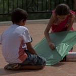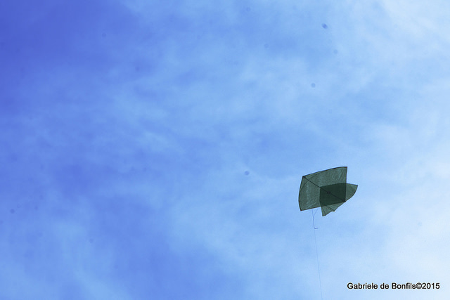 Sulla terrazza esperti e appassionati di tutte le età sfidano il debole vento nel tentativo di far decollare aquiloni di tutti i colori.