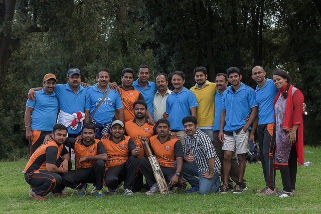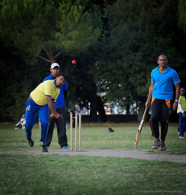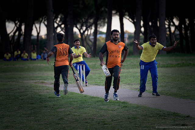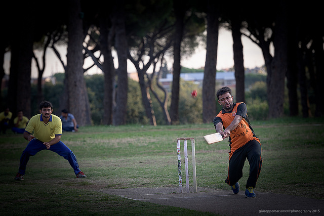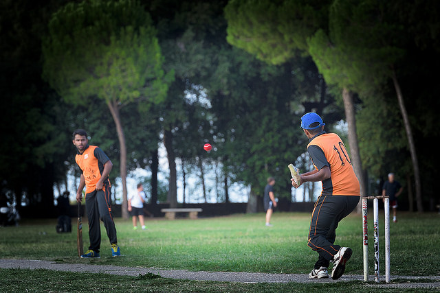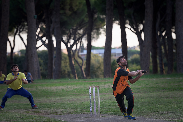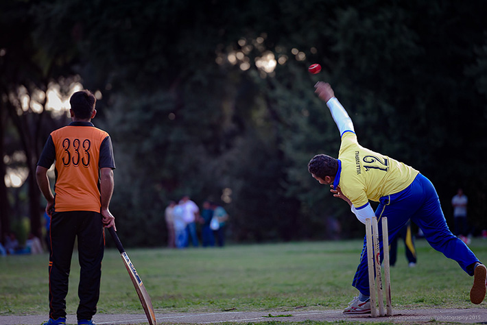 Villa Pamphili, è domenica, e tra runner che macinano faticosamente kilometri tra i sentieri del parco, bambini che giocano a pallone, mamme che conversano rilassate sui loro plaid, si sente in lontananza un rumoreggiare quasi fosse l’incitamento di tifoserie.Si vedono delle persone giocare ma il campo da gioco ha una forma strana. Circoscritto da bandierine disposte lungo il campo. Il movimento dei giocatori poi non è quello del calcio. Al centro del campo di gioco c’è una zona di lancio delimitata da tre paletti dove è posizionato un lanciatore che tira con uno strano movimento una pallina rossa verso un altro giocatore che cerca di colpirla con una mazza, ma non è baseball… È cricket. Un vero torneo di cricket, e a giocarlo è la comunità indiana principalmente proveniente dallo stato del Kerala.