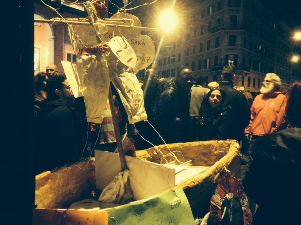 La carretta del mare – manifestazione 1 marzo per la Giornata dei Migranti“C’avete rotto li…” dice l’anziana signora che cerca di tagliare una parte del corteo dei migranti col suo carrellino della spesa. Sul palco un manifestante urla “abbiamo distrutto le loro terre e ci siamo presi le loro ricchezze”, facendo riferimento al fatto che i paesi occidentali hanno sfruttato le risorse dei territori da cui oggi persone come quelle che ora lo ascoltano migrano. E’ in questo contrasto casuale di voci, dalla strada e dal palco, tra “rotture e distruzioni”, che si potrebbe cristallizzare il momento storico che stiamo vivendo. Da una parte i migranti che spingono ai confini e dall’altra un’Europa stanca che borbotta e alza muri. L’ambientazione della scena è Roma, piazza Vittorio. E’ martedì 1 marzo – giornata del migrante – e il corteo dei manifestanti è partito intorno alle 16.30 da via di Santa Croce in Gerusalemme per raggiungere la piazza del quartiere esquilino.”Mentre le destre e i discorsi xenofobi soffiano sul vento della paura e della diffidenza, stare dalla parte dei migranti significa oggi lottare concretamente contro una precarietà e una riduzione degli spazi di libertà che riguarda tutti e tutte. Questo è il messaggio lanciato in Europa dalla piattaforma dello Sciopero Sociale Transnazionale, che ha convocato una giornata di scioperi e azioni decentralizzate e coordinate il 1 marzo, con lo slogan: «24 ore senza di noi contro i confini e la precarizzazione»”. Questo è l’appello che puntava a mettere insieme Germania, Polonia, Regno Unito, Balcani, passando per Svezia, Francia e Grecia. L’Italia e Roma hanno risposto “presente” con il corteo.Tra 300 e 400 i manifestanti – molti migranti – dicono gli organizzatori. Tanti striscioni come “i vostri muri non fermeranno la nostra dignità”, cartelli “Nessuna frontiera per i diritti di tutti”, c’è anche la riproduzione di una “carretta del mare” – una barca – che vuole rappresentare “i fantasmi dei morti nel nostro mare Mediterranneo”. Intanto Giovanna Cavallo di Action – una delle realtà sociali che hanno aderito – intona “open the border”, aprite le frontiere.Tra i manifestanti anche Mamadou Serigne che, durante il corteo, altoparlante alla mano ha incitato e sostenuto la marcia. “Non siamo colpevoli.Veniamo da paesi alle prese con dittature o disastrati economicamente, siamo in cerca di una vita migliore”. Mamadou viene dal Senegal. E’ passato per la Francia. In Italia ha fatto le scuole serali, conseguendo la terza media e il diploma di geometria. Parla molto bene. Racconta della sua integrazione, ma anche del dolore delle tante persone che ha incontrato, che frequenta, che gli parlano del dramma del viaggio attraverso il mare. Lui è stato più fortunato, non lo ha dovuto fare. Ma sa cosa significhi. Sa cosa è accaduto ai confini tra Macedonia e Grecia la sera precedente. “Sto bene qui in Italia.Non sto bene quando sento parlare i politici”.Piazza Vittorio, 1 marzo Giornata dei MigrantiGiovanna Cavallo a piazza Vittorio, giornata dei Migranti
