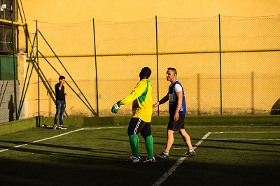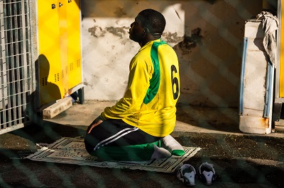 Mentre sul rettangolo di gioco la squadra degli italiani prova a tenere testa ai rifugiati, appena fuori dal campo di calcio qualcuno non smette di osservare le regole di preghiera nel mese del Ramadan, e si ritaglia uno spazio di raccoglimento, noncurante di tutto il resto che lo circonda.