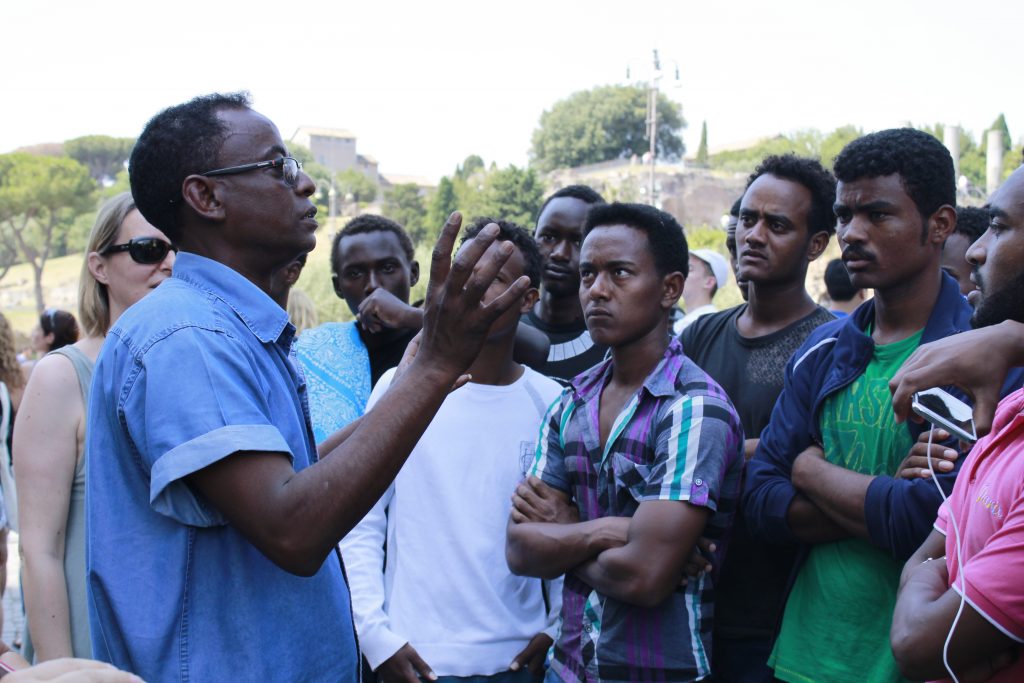 Giovedì 30 giugno: sono le dieci e in via Cupa la strada arde al sole, come sempre. I volontari di Baobab experience hanno organizzato un evento con i ragazzi, in maniera da farli distrarre e allo stesso tempo farli sentire accolti in quella che per un po’ sarà la loro città. Il Centro Diurno di via Montesanto (ASL Roma E) che si occupa di malati psichiatrici e l’associazione porteranno, per la terza volta nell’anno, i ragazzi a fare un giro per il centro di Roma. Mete previste: Colosseo, Fori, Palatino ed Arco di Costantino, passeggiando per la Via Sacra.A fare da guida, Daniela Ferrara, storica dell’arte accompagnata dall‘interprete, attivista, migrante Mulugheta. Insieme a loro ci sono Roberto, Yassin e Andrea, ospiti del centro diurno, che sono molto contenti di fare da accompagnatori.Roberto racconta che la prima volta si sono divertiti molto: “C’era una mediatrice eritrea e poi io parlo un po’ d’inglese, ce la siamo cavata. La seconda volta a piazza Navona è stato più difficile perché i ragazzi non parlavano inglese e non c’era un mediatore, però in qualche modo ci siamo capiti, hanno fatto foto e mangiato un gelato”.Questa volta i partecipanti sono tantissimi, una trentina di ragazzi della tendopoli principalmente sudanesi, eritrei ed etiopi, ma non mancano un nigeriano, un somalo e un ragazzo della Guinea.“Il progetto di visite guidate in collaborazione con il Baobab è stato presentato al comune ma quest’anno, vista la situazione precaria, è stato più difficile realizzarlo, spiega Gabriella operatrice, educatrice riabilitativa psichiatrica. “In fondo le due realtà sono binari che si intrecciano. La cura che intendiamo noi è cura come viaggio e gli obiettivi a volte sono poco rilevanti ciò che ci interessa è più che altro il percorso: in questo senso il contatto con persone che hanno fatto un viaggio è molto utile per i nostri ragazzi, perché in qualche modo anche loro hanno attraversato un deserto, che a volte ha compromesso la salute mentale.Darsi la possibilità di incontrare i migranti, mostrando qualcosa che ci apparteneva, la storia di Roma, contribuisce a rendere l’esperienza un’esperienza umana e a noi ci aiuta a non sentirci soli”.Sono le undici i ragazzi del centro diurno e gli ospiti dei Baobab, insieme ad alcuni volontari, lasciano via Cupa: direzione Colosseo.Daniela distribuisce ai ragazzi i biglietti e tutti insieme si incamminano verso la metro alla stazione Tiburtina. Tre vagoni si riempiono di ragazzi neri che parlano diverse lingue tra lo stupore dei passeggeri.Il Colosseo li accoglie maestoso e gremito di turisti e anche loro per un attimo si scordano di via Cupa e del viaggio che li ha portati lì e diventano turisti, si guardano intorno, chiacchierano, fanno foto, si siedono all’ombra.